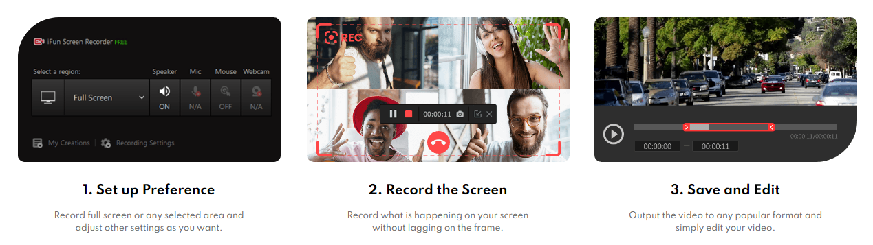 ในเว็บไซต์ของโปรแกรม iFun Screen Recorder จะเห็นว่าแนะนำการใช้งานเพียง 3 ขั้นตอนเท่านั้น เพียงตั้งค่าเบื้องต้น เริ่มอัดวิดีโอ และนำมาตัดต่อก่อนเซฟเก็บได้ สื่อถึงความใช้งานง่าย สะดวกของโปรแกรมนั่นเอง