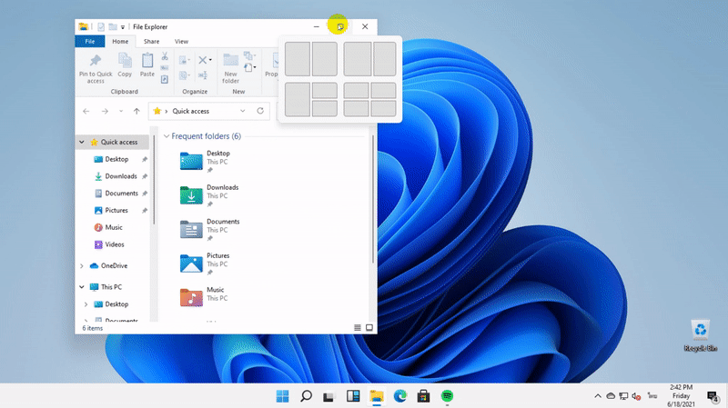 "ปุ่มขยายหน้าจอ" (☐) ในระบบปฏิบัติการ Windows 11 นี้ มีลูกเล่นที่ฉลาดกว่าเดิมมาก จากเดิมที่เอาไว้ขยาย หรือย่อหน้าต่างเพียงอย่างเดียว ใน Windows เวอร์ชันนี้ หากเราเอาเคอร์เซอร์เมาส์ไปชี้ลองเหนือปุ่ม จะมีตัวเลือก Windows Snap ช่วยจัดวางตำแหน่งหน้าต่างโปรแกรมปรากฏขึ้นมาให้เราเลือกใช้งานได้หลายรูปแบบเลย