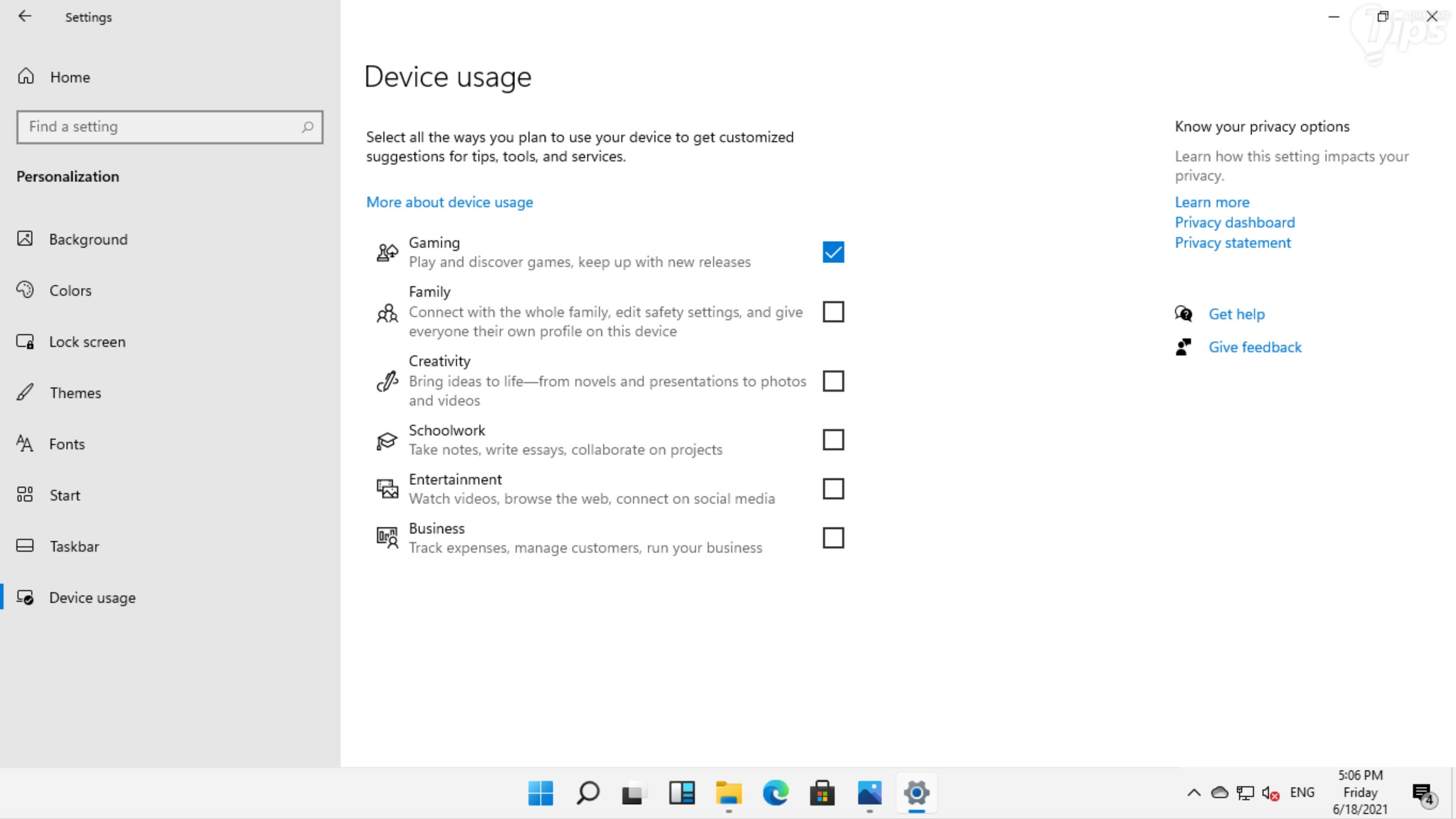 ในตัวเลือกการตั้งค่า Personalization เราสังเกตพบว่ามี "เมนู Device Usage" เพิ่มเข้ามา โดยแจ้งว่าเป็นการปรับค่าคำแนะนำ, เครื่องมือ และบริการ ให้เหมาะสมกับความต้องการของผู้ใช้งาน โดยมีตัวเลือกเป็น