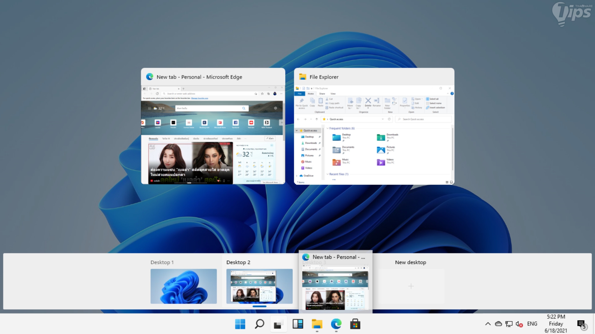 ข้อมูลที่อยู่ใน "ปุ่ม Task View" ของระบบปฏิบัติการ Windows 10 จะค่อนข้างรก แต่ในระบบปฏิบัติการ Windows 11 จะมาแบบโล่งสบายตา แยกหน้าจอเดสก์ท็อป (Desktop Screen) กับงานที่เปิดอยู่อย่างชัดเจน เลยล่ะ