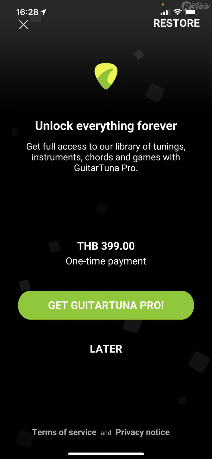 - สามารถใช้งานได้ฟรีไม่มีค่าใช้จ่าย แต่ถ้าหากต้องการปลดล็อกตัวจูนเนอร์ของทุกเครื่องเสียงที่มีให้ และปลดล็อกทุกแบบเรียนภายในแอป จะมีค่าใช้จ่ายอยู่ที่ 399 บาท (จ่ายครั้งเดียวจบ)