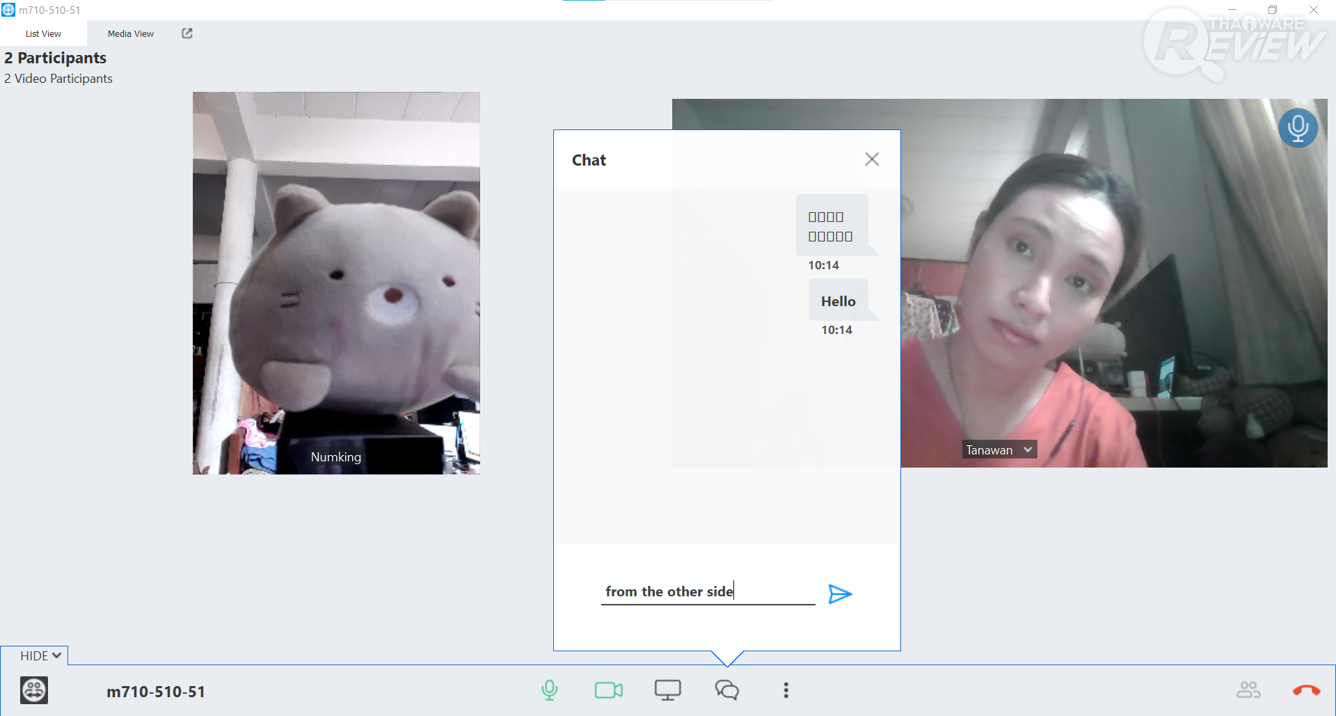 จากการทดสอบแชทระหว่างประชุม พบว่า ระบบทำงานได้อย่างรวดเร็ว มีเพียงช่องพิมพ์ข้อความและปุ่มลูกศรสำหรับกดส่ง ไม่มีอีโมจิ สติกเกอร์น่ารัก ๆ มาให้ แต่ตัวโปรแกรมกลับไม่แสดงผลภาษาไทย กลับกลายเป็นก้อนสี่เหลี่ยมเรียงกัน แต่ยังแสดงข้อความภาษาอังกฤษตามปกติ ซึ่งคาดว่าอาจจะเป็นบัคในโปรแกรมที่ซ่อนอยู่ก็เป็นได้