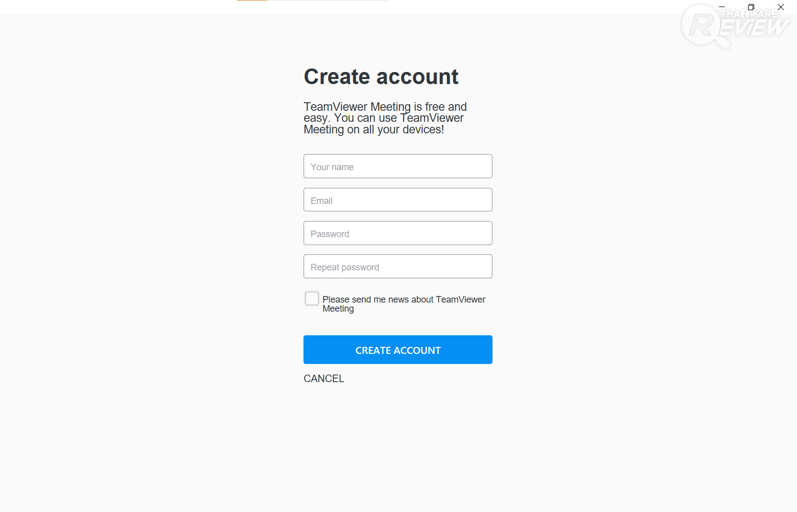 หลังจากติดตั้งโปรแกรมเรียบร้อยแล้ว จะพบกับหน้าตาของ TeamViewer Meeting ที่ดูเรียบง่าย โดยตัวโปรแกรมแบ่งออกเป็น 2 ส่วน ก็คือแถบเมนูหลักด้านซ้ายมือ และพื้นที่ด้านขวาสำหรับใช้งานเมนูนั้น ๆ แต่ก่อนอื่น จะต้องทำการ "สมัครบัญชี (Create Account)" กับทาง TeamViewer เสียก่อน