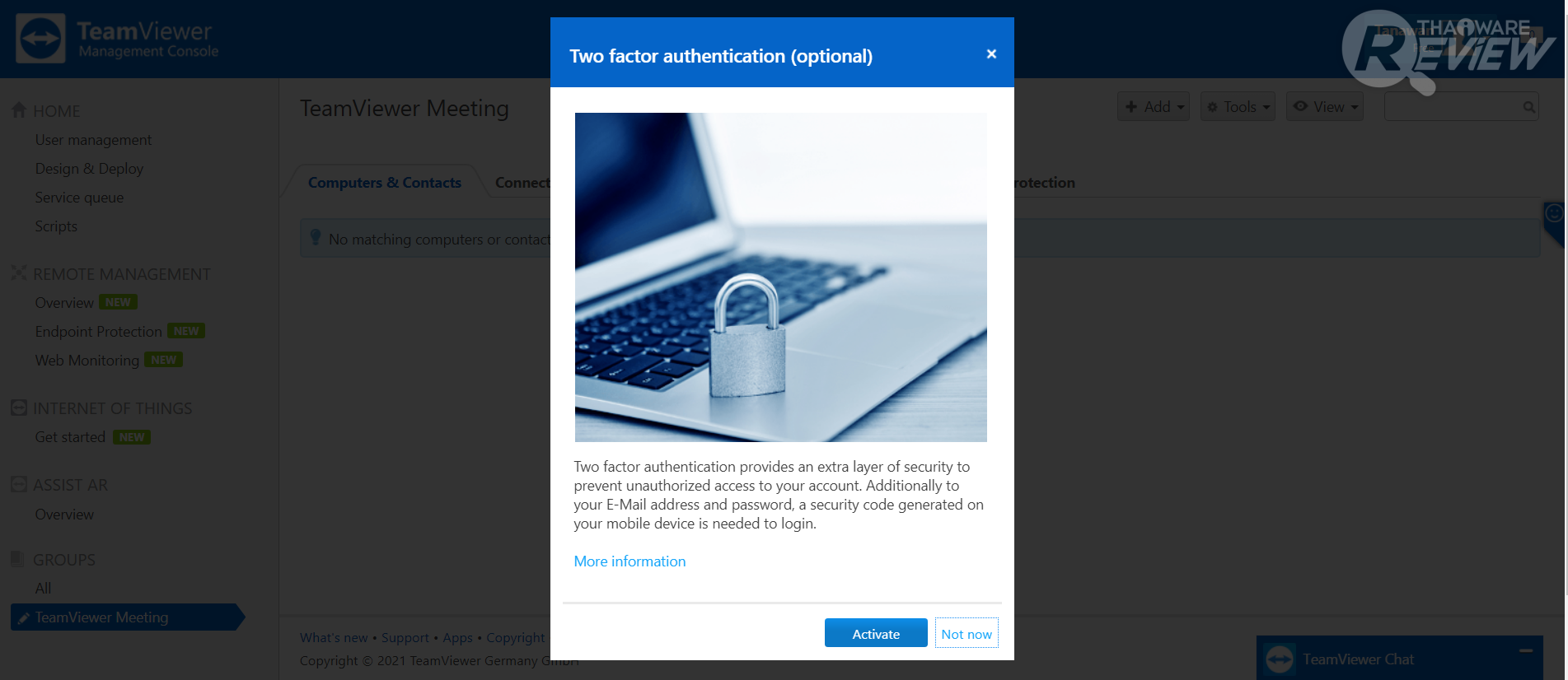 หลังจากสมัคร TeamViewer เสร็จสิ้น ระบบจะยังไม่ให้ Sign in ในทันที แต่จะต้องเข้าไป "Activate Account" ในอีเมลที่ใช้สมัคร และความพิเศษของโปรแกรม TeamViewer Meeting ก็คือ บังคับให้ผู้ใช้เข้าสู่ระบบ (Login) ในรูปแบบ การยืนยันตัวตน 2 ชั้น (Two-Factor Authentication หรือ 2FA) เพื่อป้องกันไม่ให้ผู้อื่นมาสวมรอยใช้งาน และมั่นใจได้ในความปลอดภัย ฉะนั้น ขอแนะนำให้มี แอปพลิเคชัน Authenticator ติดมือถือไว้ด้วย สำหรับรับรหัสเพื่อการ Login ที่ปลอดภัยกว่า