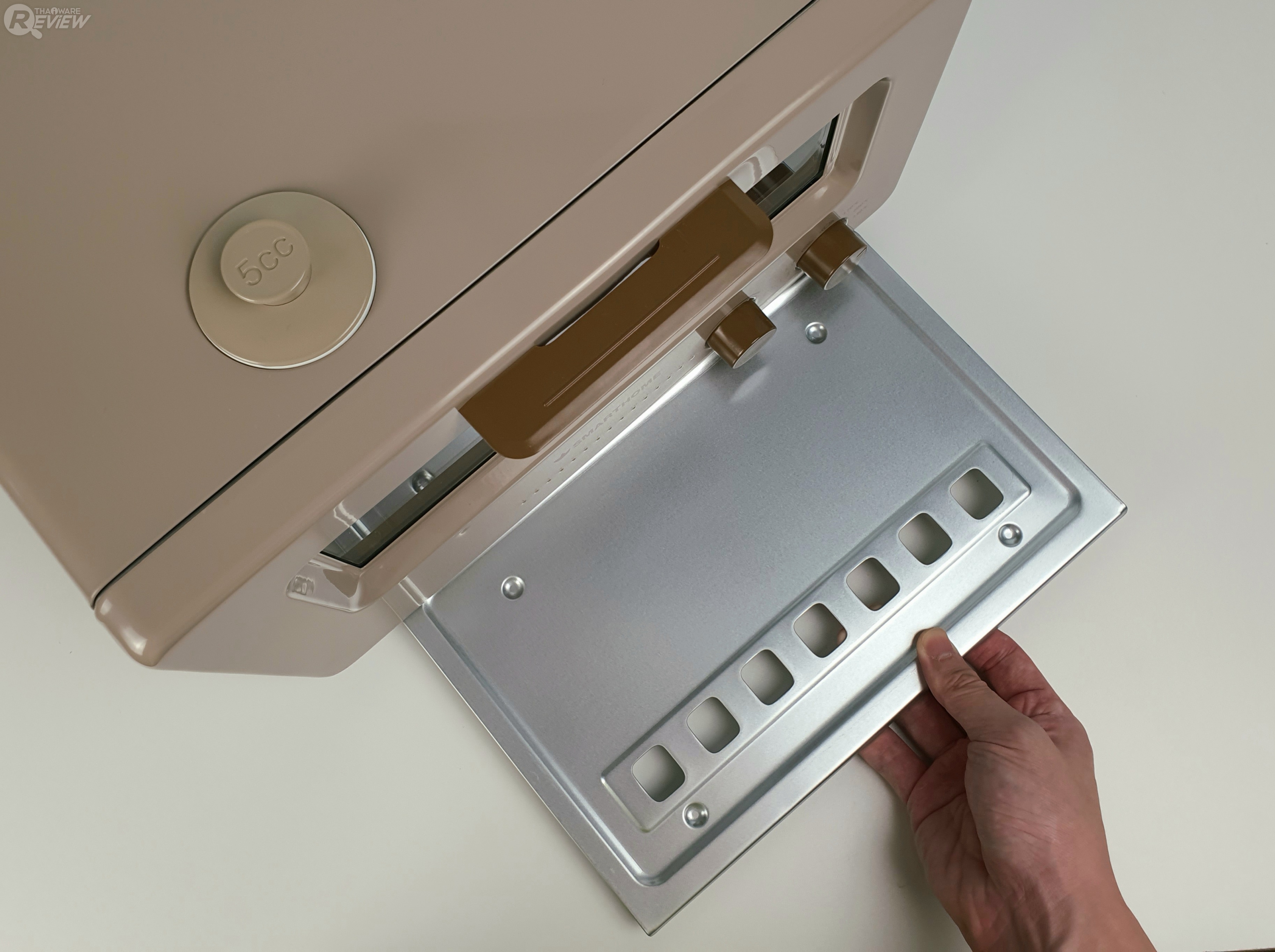 ด้านใต้ของเตาอบ มีถาดอลูมิเนียมรองไว้ สำหรับรองเศษขนมหรือเศษอาหารที่อาจตกลงมาระหว่างใช้งาน ทำให้สามารถถอดล้างทำความสะอาดได้ง่าย