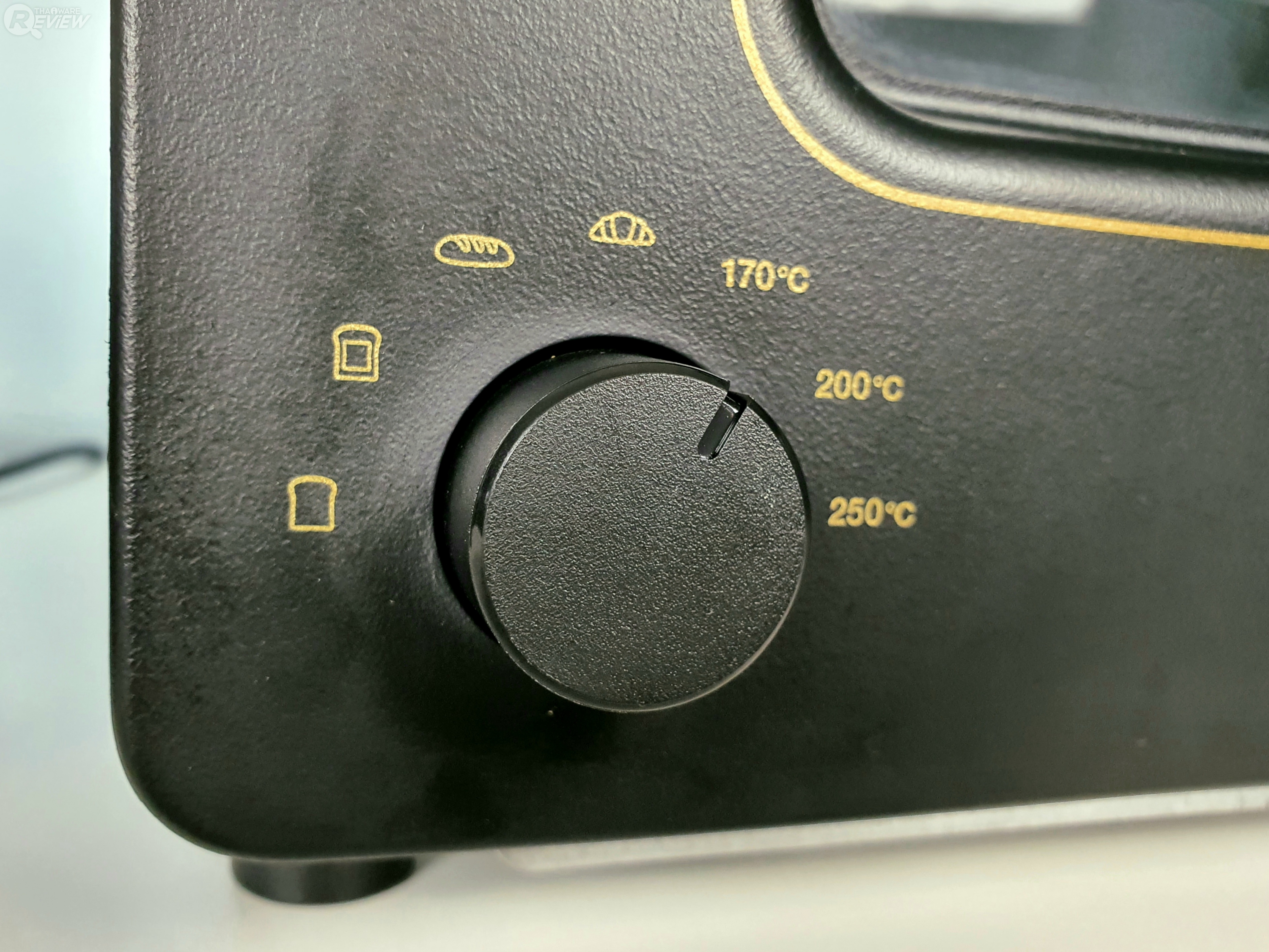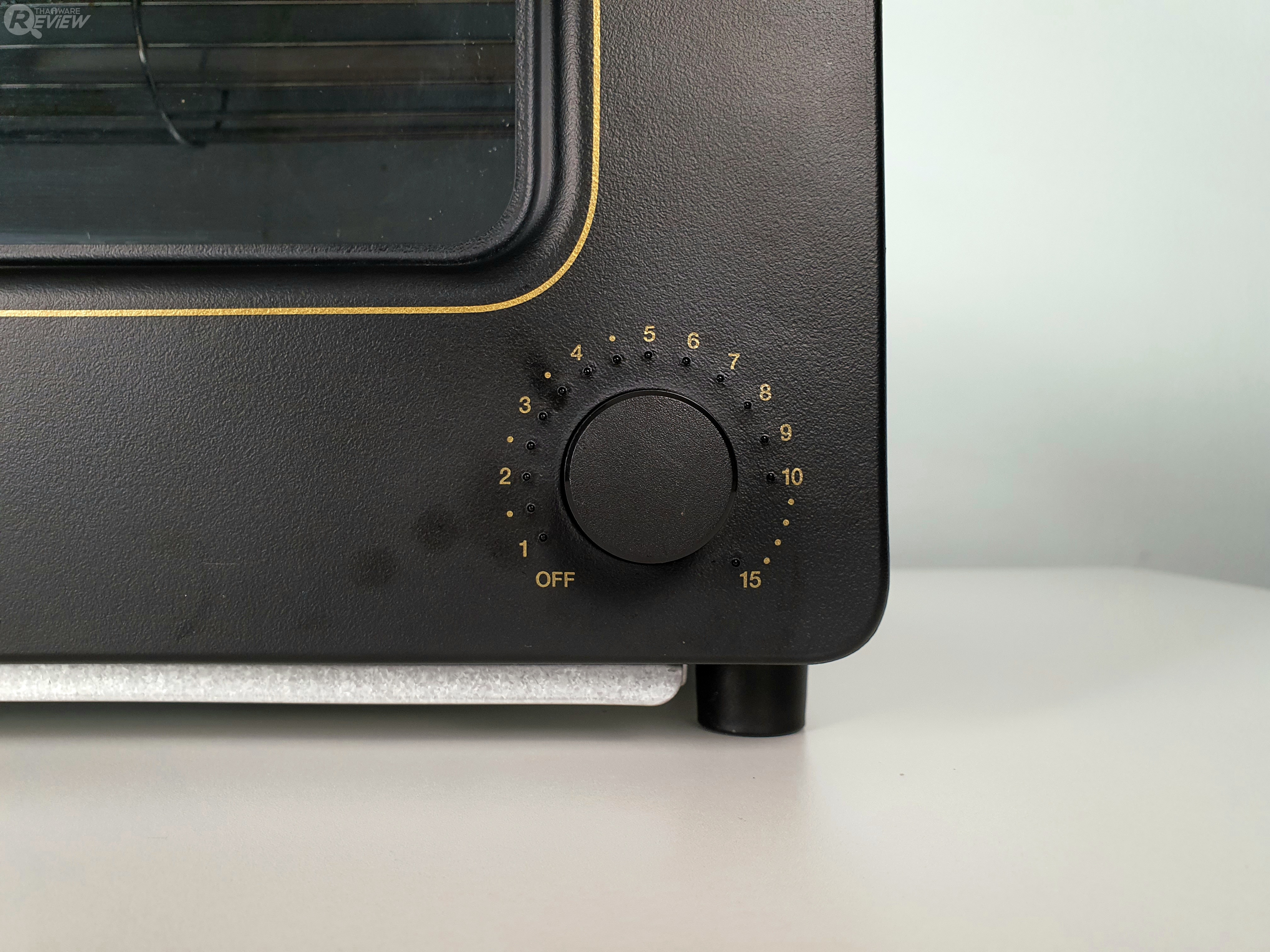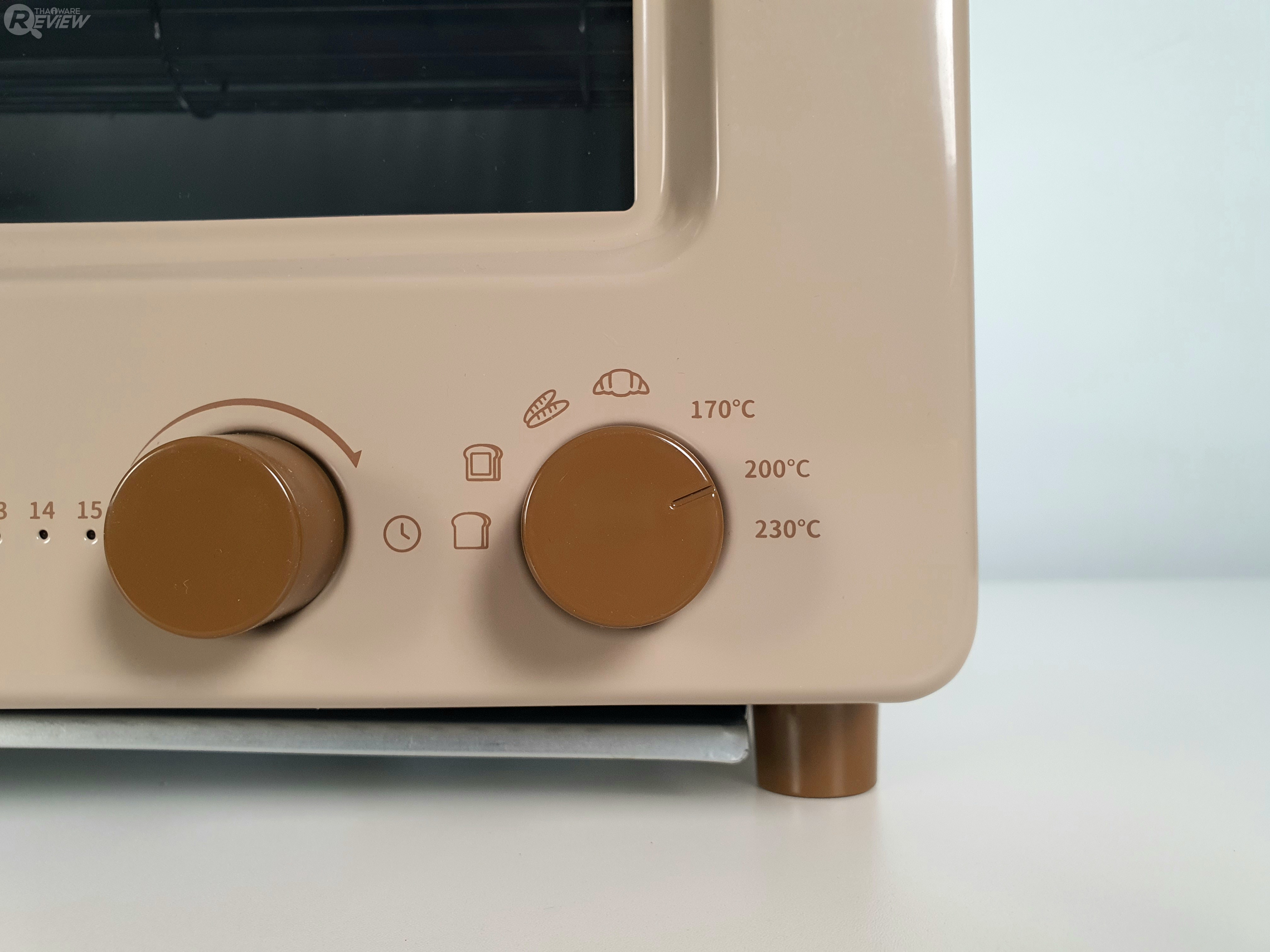 อีกปุ่มที่อยู่คู่กันคือปุ่มตั้งเวลาในการอบเหมือนกับเตาติ้งทั่ว ๆ ไป สามารถตั้งได้ตั้งแต่ 1 - 15 นาที แต่ต่างกันตรงที่ เตาจะมีความดิจิทัล การหมุนเลือกเวลาก็จะมีไฟติดตามระยะเวลาที่เราเลือก ปุ่มไม่ได้ค่อย ๆ หมุนดีดกลับเหมือนเตาปิ้งโบราณทั้งหลาย หากเราต้องการอบขนม 1 ชิ้นที่อุณหภูมิ 170 องศาเซลเซียส เป็นเวลา 15 นาที ก็ให้จัดการหมุนปุ่มขวาหรือปุ่มอุณหภูมิก่อน แล้วค่อยหมุนปุ่มตั้งเวลา เพื่อเปิดการทำงานของเตาอบ