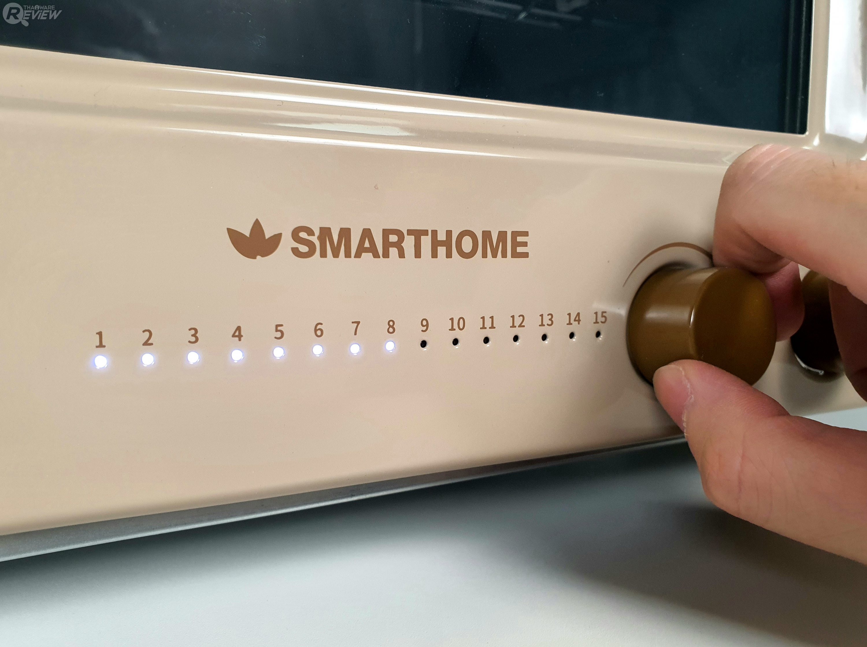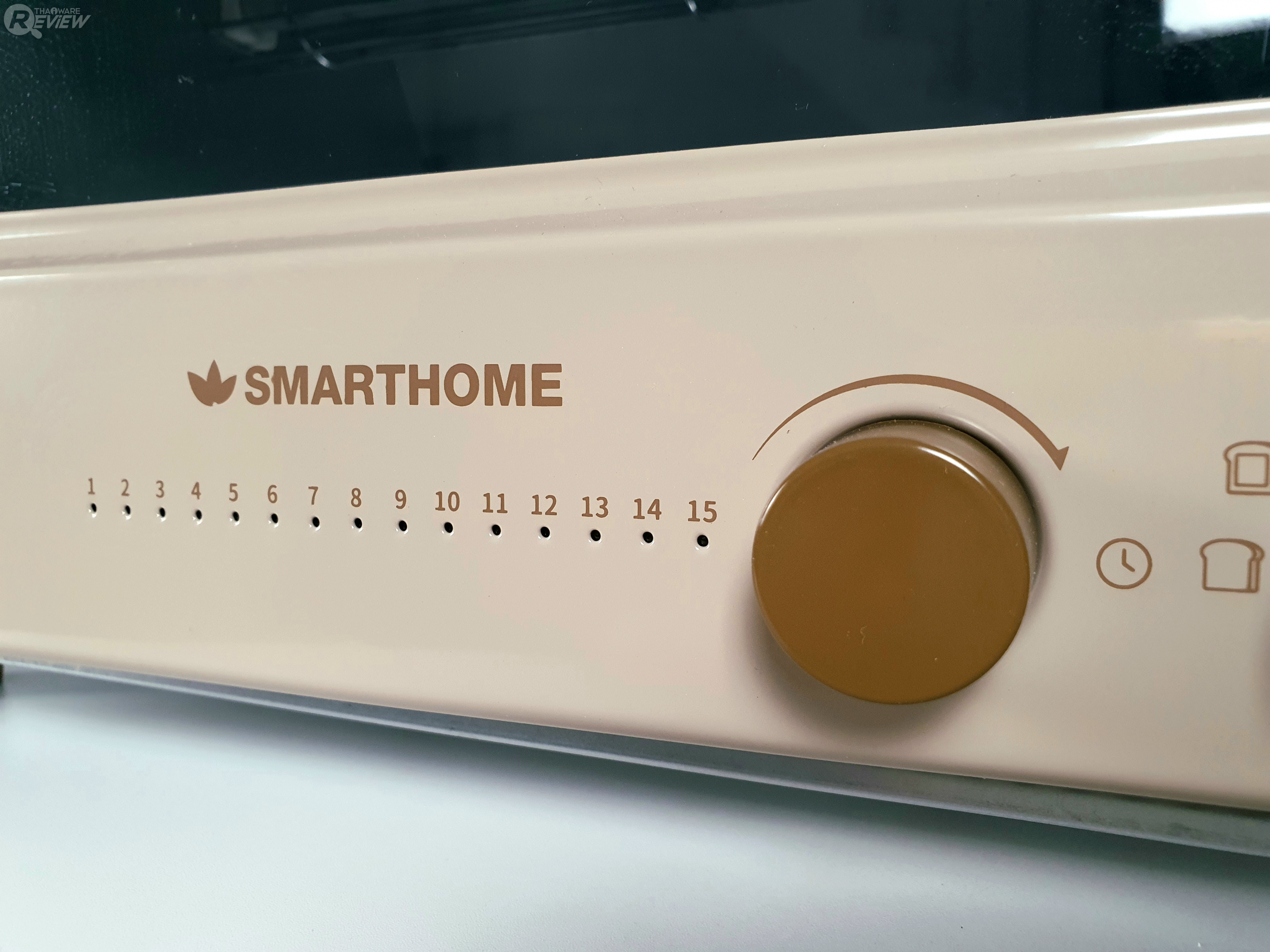 การออกแบบเตาอบไอน้ำไฟฟ้า SMARTHOME มาในโทนสีครีม - สีกาแฟ เป็นสีของตัวเครื่องภายนอก ที่คนชอบเอิร์ธโทน (Earth Tone) น่าจะถูกใจสิ่งนี้กัน บริเวณด้านหน้าของเตาอบ มีลิ้นสำหรับดึงปิด - เปิด ฝาเตาอบ, มีช่องกระจกสำหรับส่องดูระดับความสุกของอาหาร, และมีปุ่มหมุนสองปุ่มอยู่ด้านหน้า ไว้สำหรับหมุนปรับอุณหภูมิ และปรับตั้งเวลาใช้งาน