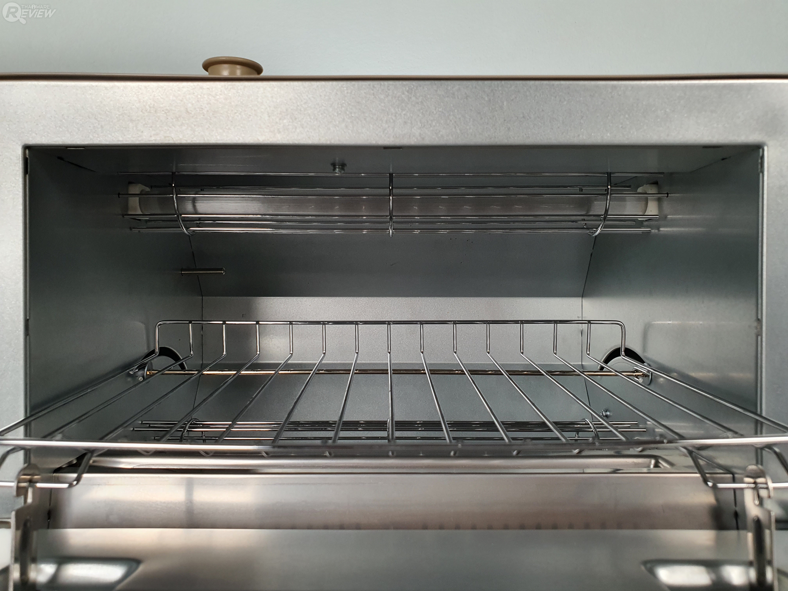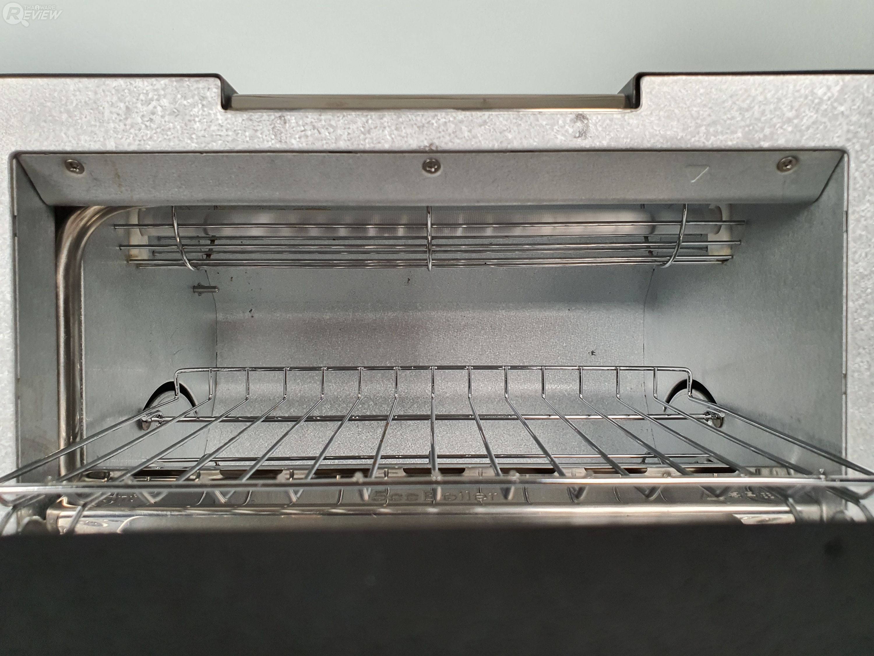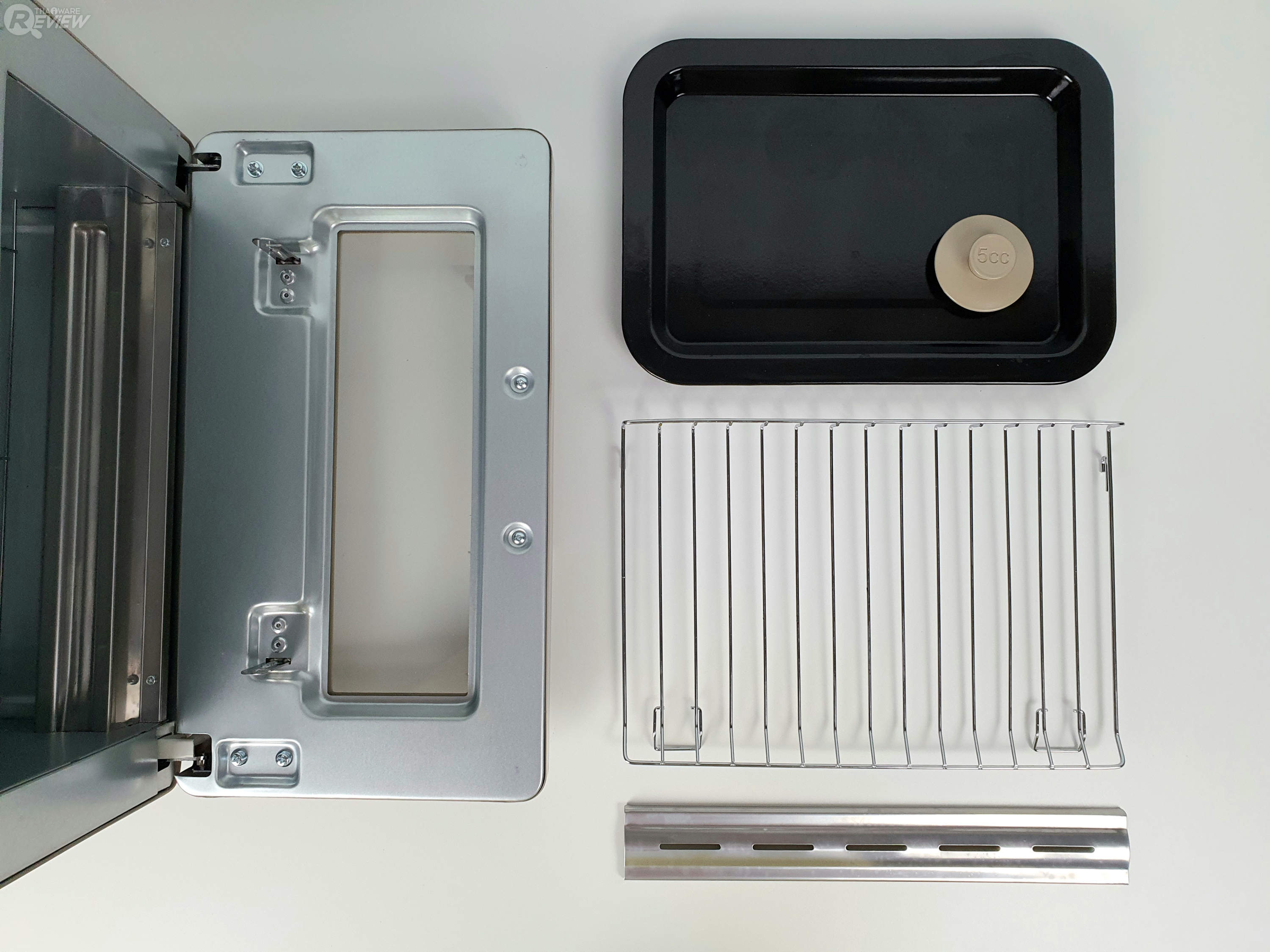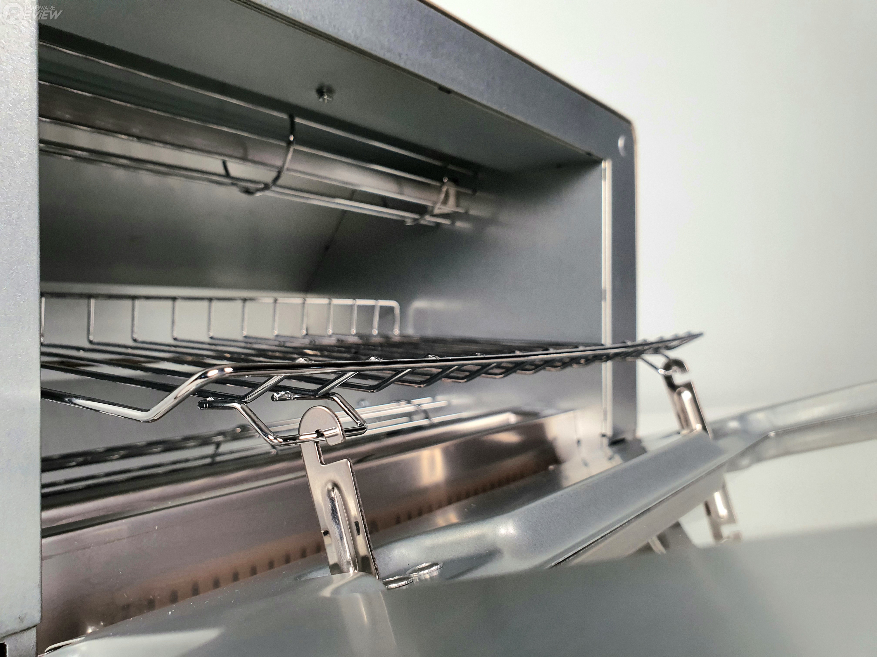 ด้านในเตาอบจะมีตะแกรงไว้สำหรับวางถาดอบ (มีถาดอบแถมให้ภายในกล่อง) ที่สามารถถอดล้างได้ง่าย โดยมีจุดยึดเหนี่ยวเพียงไม่กี่จุดเท่านั้น ได้แก่ จุดนอกที่เป็นขาเกี่ยวด้านใต้ตะแกรงติดกับฝาเตาอบ และด้านในที่เกี่ยวไว้กับสปริงกลไกสำหรับเลื่อนตะแกรงเข้า - ออก เวลาถอดล้างให้ทำการถอดจากด้านที่ติดกับฝาเตาอบออกก่อน แล้วจึงค่อยนำออกจากขาเกี่ยวด้านใน ส่วนเวลาใส่กลับคืน ก็ให้เริ่มจากการเกี่ยวขาเกี่ยวด้านใน แล้วจึงนำมาเกี่ยวกับขาเกี่ยวด้านที่ติดกับฝาเตาอบตามลำดับ