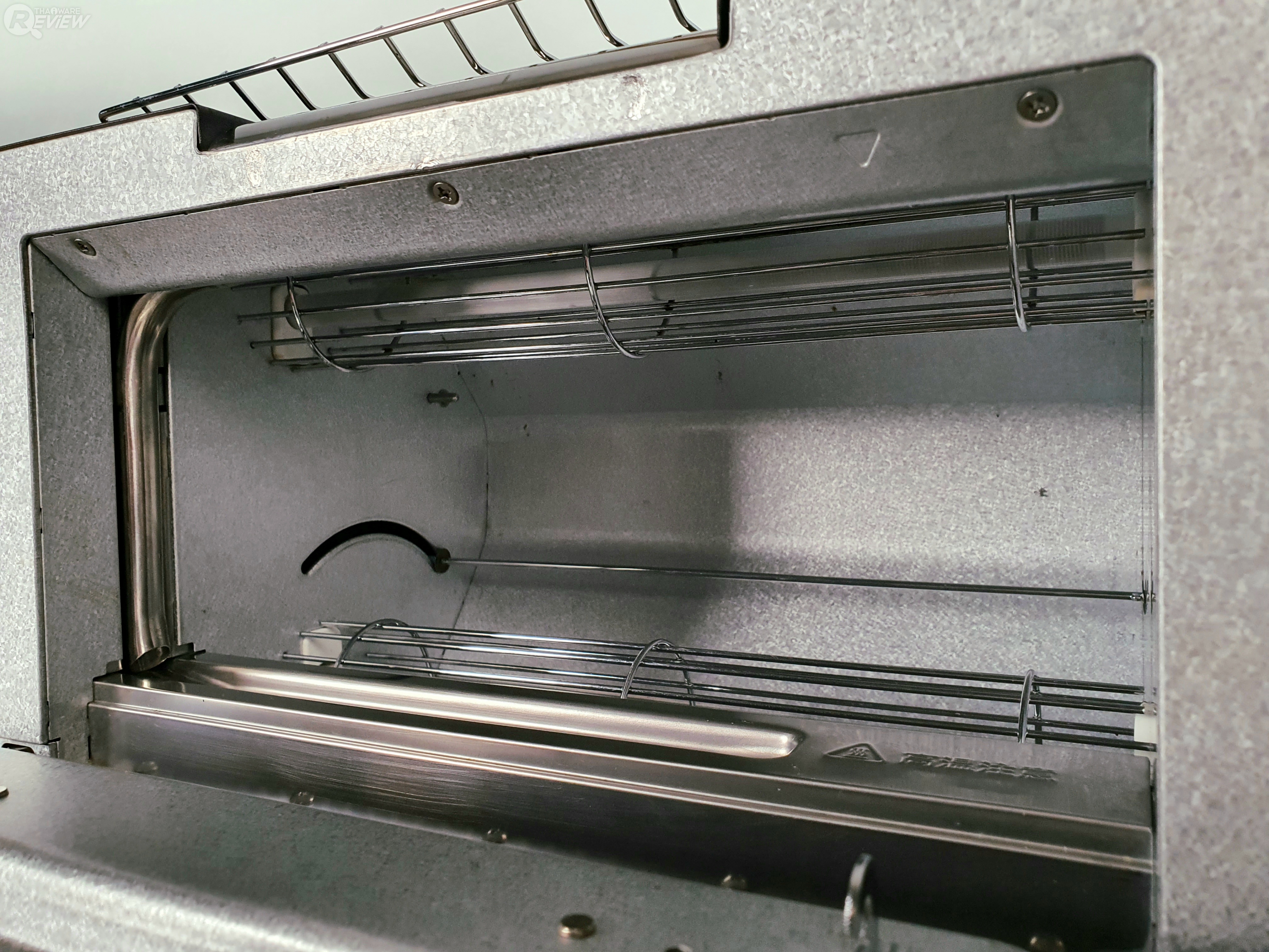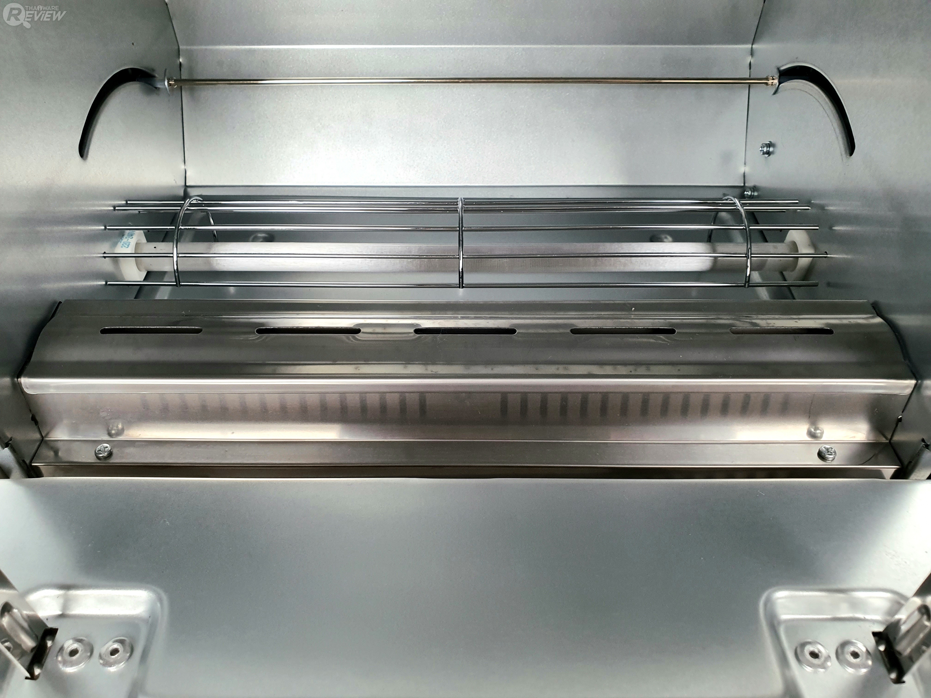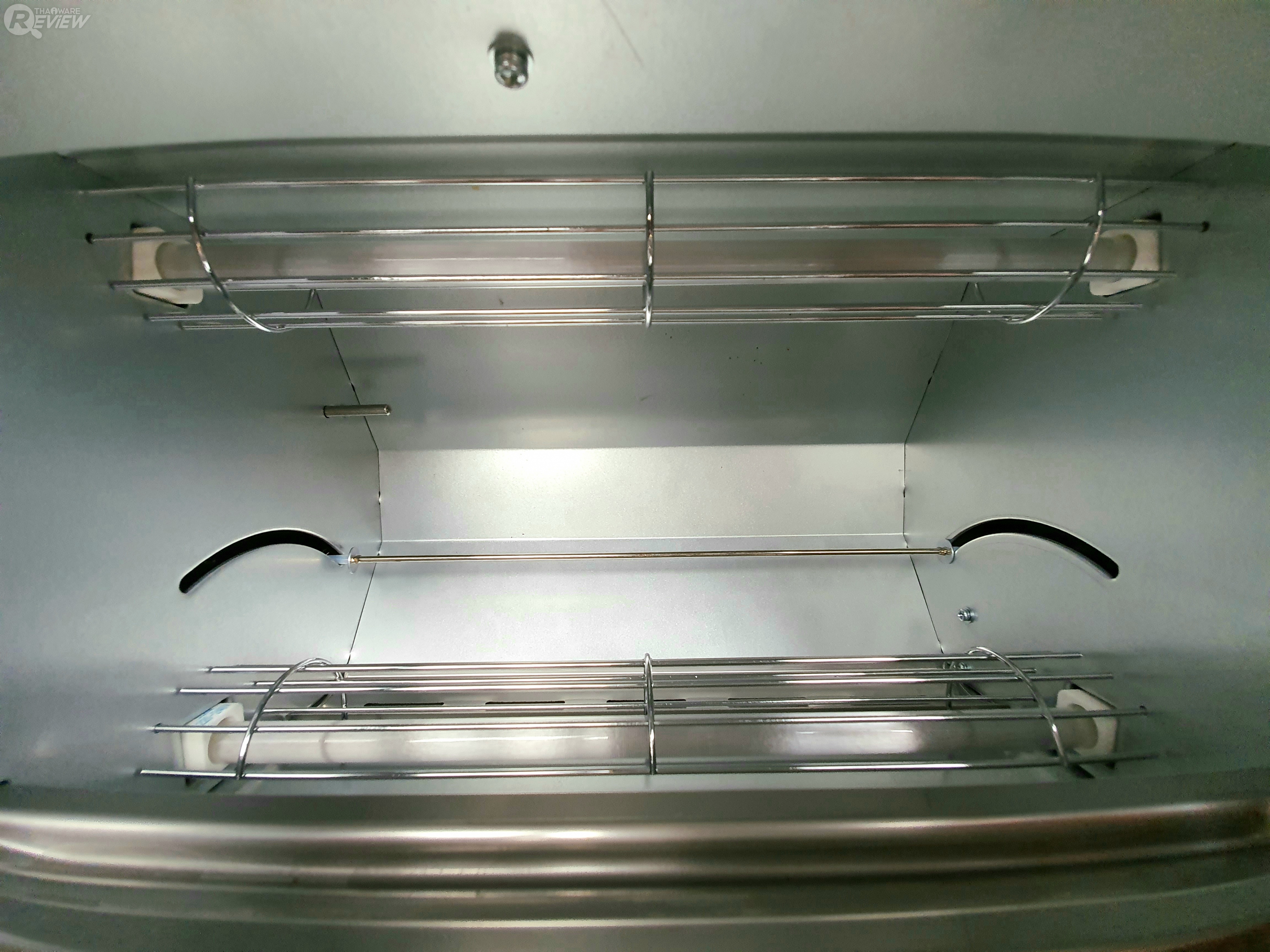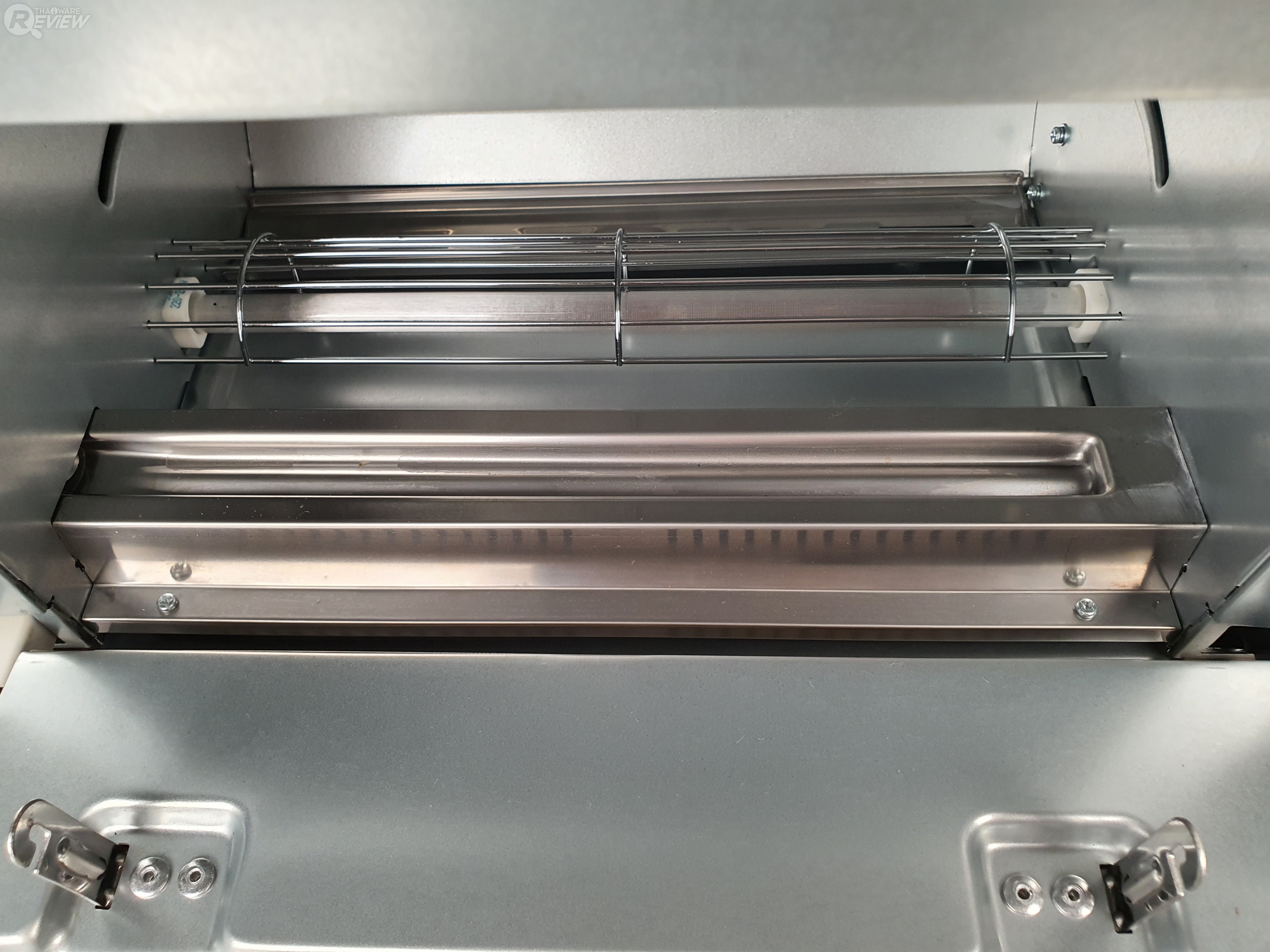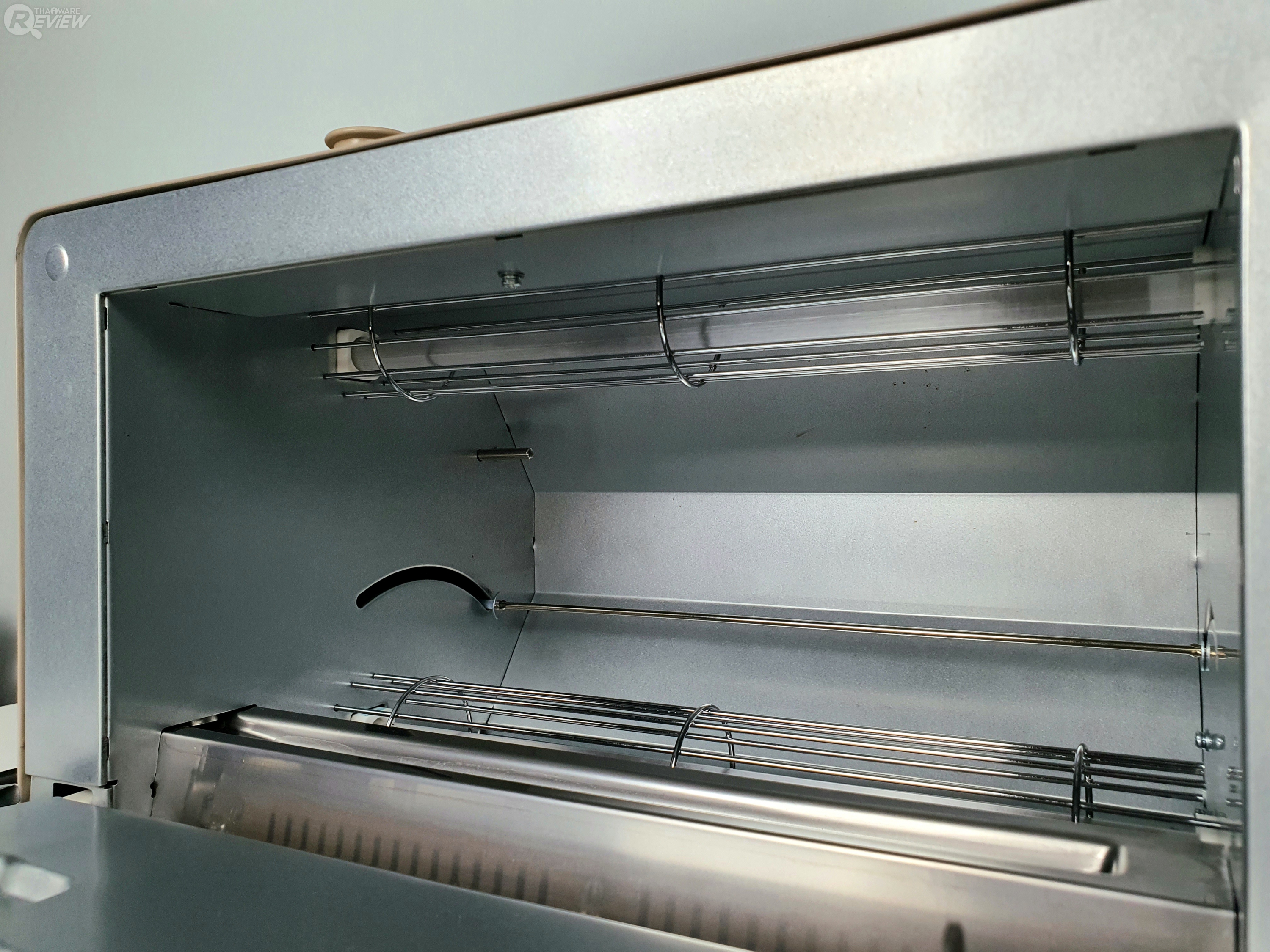 ด้านในเตาอบจะมีตะแกรงไว้สำหรับวางถาดอบ (มีถาดอบแถมให้ภายในกล่อง) ที่สามารถถอดล้างได้ง่าย โดยมีจุดยึดเหนี่ยวเพียงไม่กี่จุดเท่านั้น ได้แก่ จุดนอกที่เป็นขาเกี่ยวด้านใต้ตะแกรงติดกับฝาเตาอบ และด้านในที่เกี่ยวไว้กับสปริงกลไกสำหรับเลื่อนตะแกรงเข้า - ออก เวลาถอดล้างให้ทำการถอดจากด้านที่ติดกับฝาเตาอบออกก่อน แล้วจึงค่อยนำออกจากขาเกี่ยวด้านใน ส่วนเวลาใส่กลับคืน ก็ให้เริ่มจากการเกี่ยวขาเกี่ยวด้านใน แล้วจึงนำมาเกี่ยวกับขาเกี่ยวด้านที่ติดกับฝาเตาอบตามลำดับ