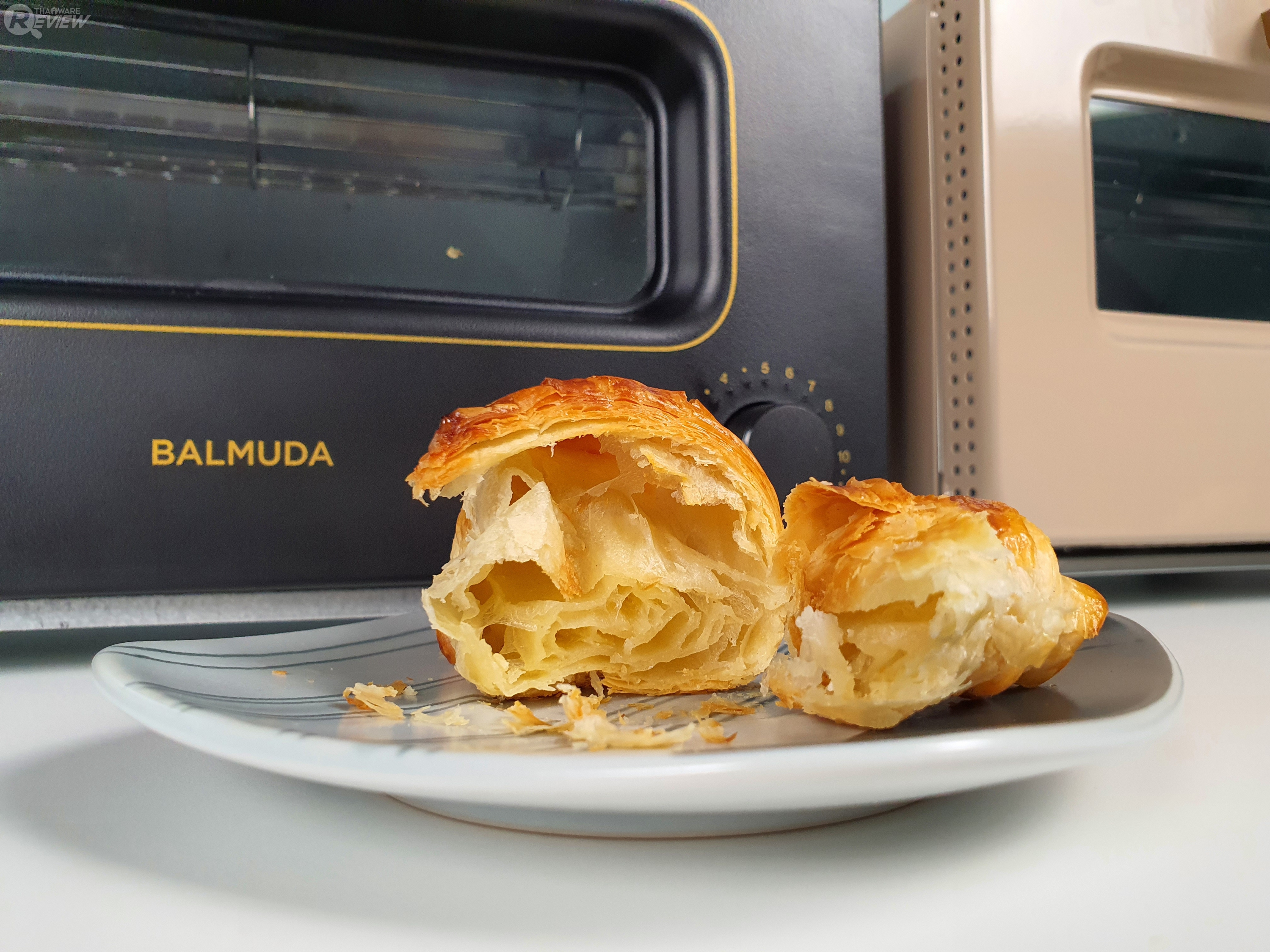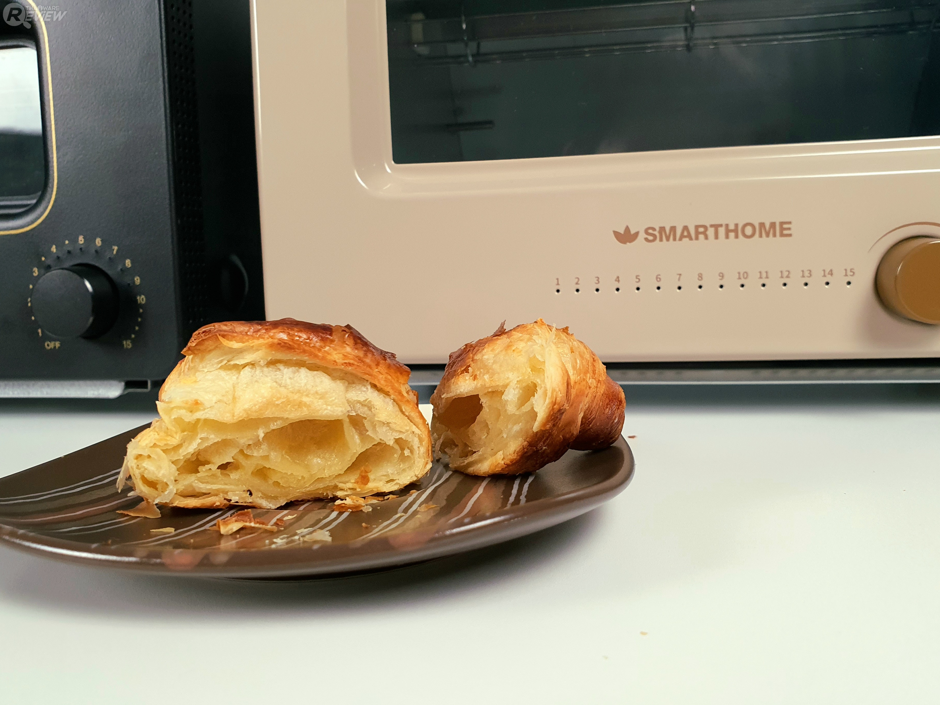 ในส่วนของเนื้อครัวซองต์ที่ได้ ตัวครัวซองต์มีความฟูขึ้นมาพอ ๆ กัน แม้ว่าจะเป็นไฟบน-ล่างเหมือนกัน แต่ในส่วนของครัวซองต์ที่ได้จากเตาอบ SMARTHOME เนื้อตรงขอบบน-ล่างจะมีสีที่ต่างจากตรงกลางพอสมควร ส่วนฝั่ง BALMUDA สีค่อนข้างใกล้เคียงกัน (แต่จริง ๆ เนื้อด้านหน้าครัวซองต์ค่อนข้างขาว) ด้านในมีความสุกเหมือนกัน น่าจะเพราะมีไอน้ำช่วยทำความร้อน ทั้งคู่มีความกรอบนอกนุ่มในใกล้เคียงกัน ถ้าได้แรงไฟและเวลาที่เหมาะสมจากการทดลองทำหลาย ๆ รอบ เตาอบทั้ง 2 รุ่น ก็อบขนมปังได้ไม่น่าจะต่างกันมาก