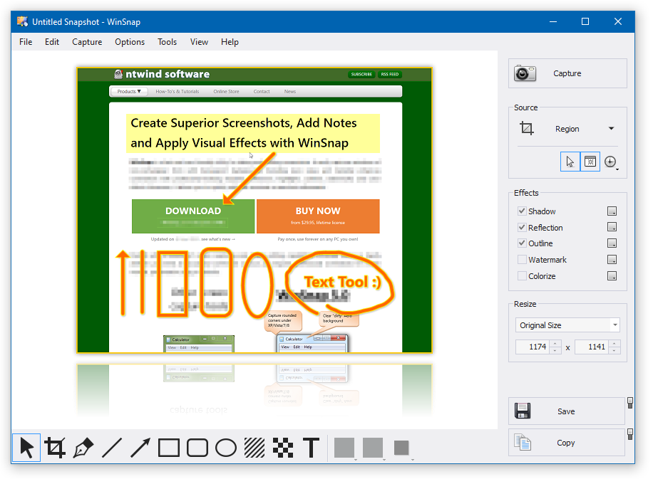 โปรแกรม WinSnap เป็นโปรแกรมที่มีความน่าสนใจ ทั้งขนาดโปรแกรมที่เล็ก การใช้งานที่ง่าย เมนูรองรับหลายภาษา (แต่ไม่มีภาษาไทยนะ) นำภาพมาตกแต่งเพิ่มเติมได้ทั้งเพิ่มข้อความที่ไม่ใช่ไก่กา แต่ยังเปลี่ยนสี เปลี่ยนฟอนต์ได้ตามชอบ, เพิ่มโมเสคปิดบังเนื้อหา, วาดเส้น วาดรูปวงกลม สี่เหลี่ยม, ตัดรูปภาพ (Crop Image) ให้ได้ตามต้องการก็ได้ หรือจะย่อขนาดรูปภาพ (Resize Image) ให้ได้ขนาดพอดี ๆ โปรแกรม WinSnap ก็สามารถจัดให้ได้สบาย ๆ