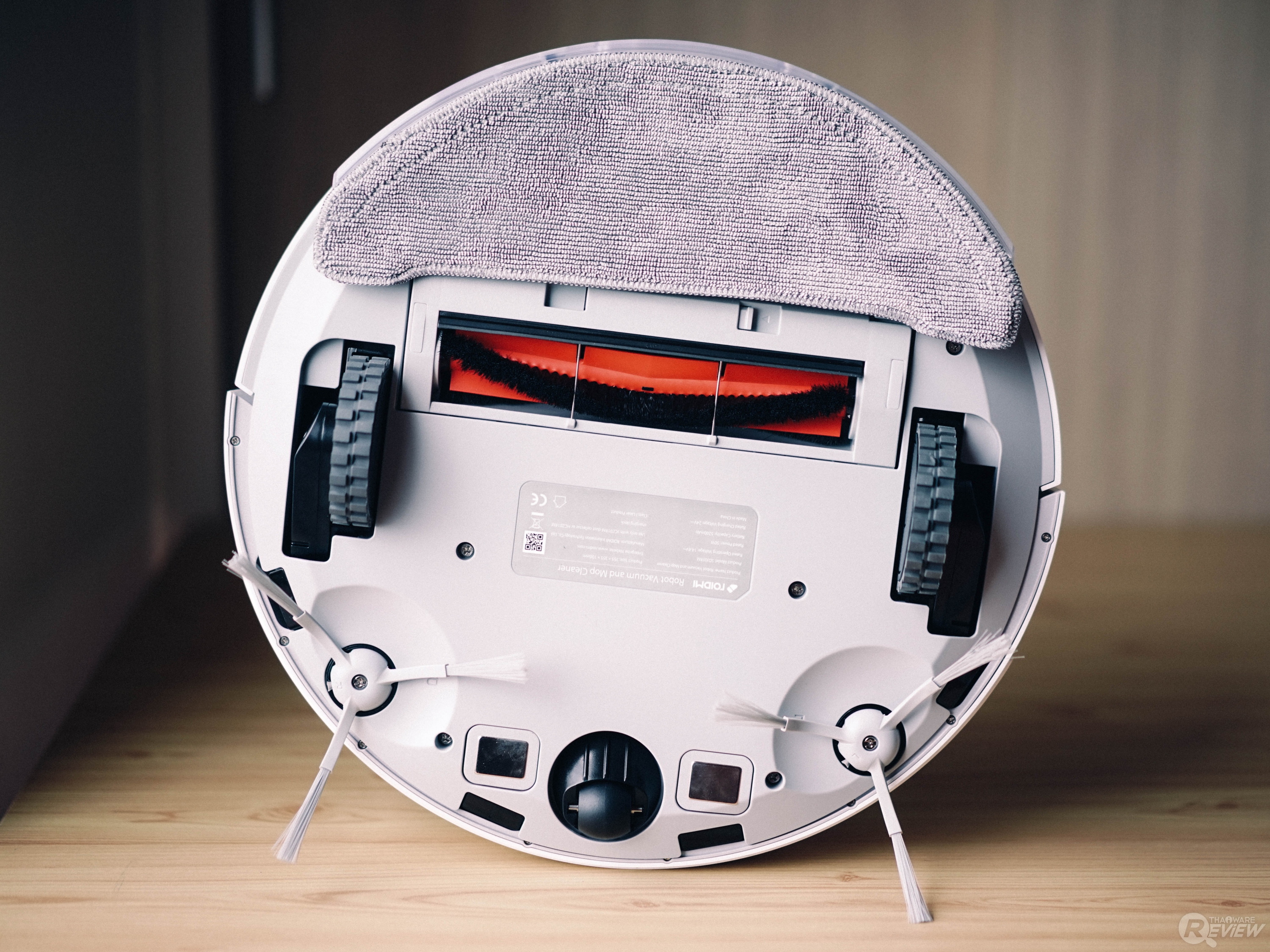 พลิกกลับมาดูใต้ตัวหุ่นยนต์ดูดฝุ่นกันบ้าง ด้านล่างไม่มีอะไรที่แตกต่างไปจากหุ่นยนต์ดูดฝุ่นรุ่นอื่น ๆ ที่เราเคยใช้งานมาก่อน มันอาจเป็นดีไซน์ที่ผ่านการทดสอบมาจากผู้ผลิตทุกคนแล้วพบว่า นี่เป็นดีไซน์ที่ดีที่สุดในขณะนี้แล้วล่ะมั้ง คือ มีล้อใหญ่ที่มีโช๊ค 2 ล้อ, ล้อนำทางด้านหน้า 1 ล้อ, ข้างล้อนำทางจะมีเซนเซอร์เช็คขอบสำหรับกันตก, มีแปรงปัดด้านข้าง 2 ฝั่ง, แปรงปัดขนาดใหญ่ (สีแดง) สำหรับปัดฝุ่นเข้าถังเก็บขยะ และมีที่สำหรับติดผ้าม็อบถูพื้น อยู่ต่อท้ายแปรงปัด