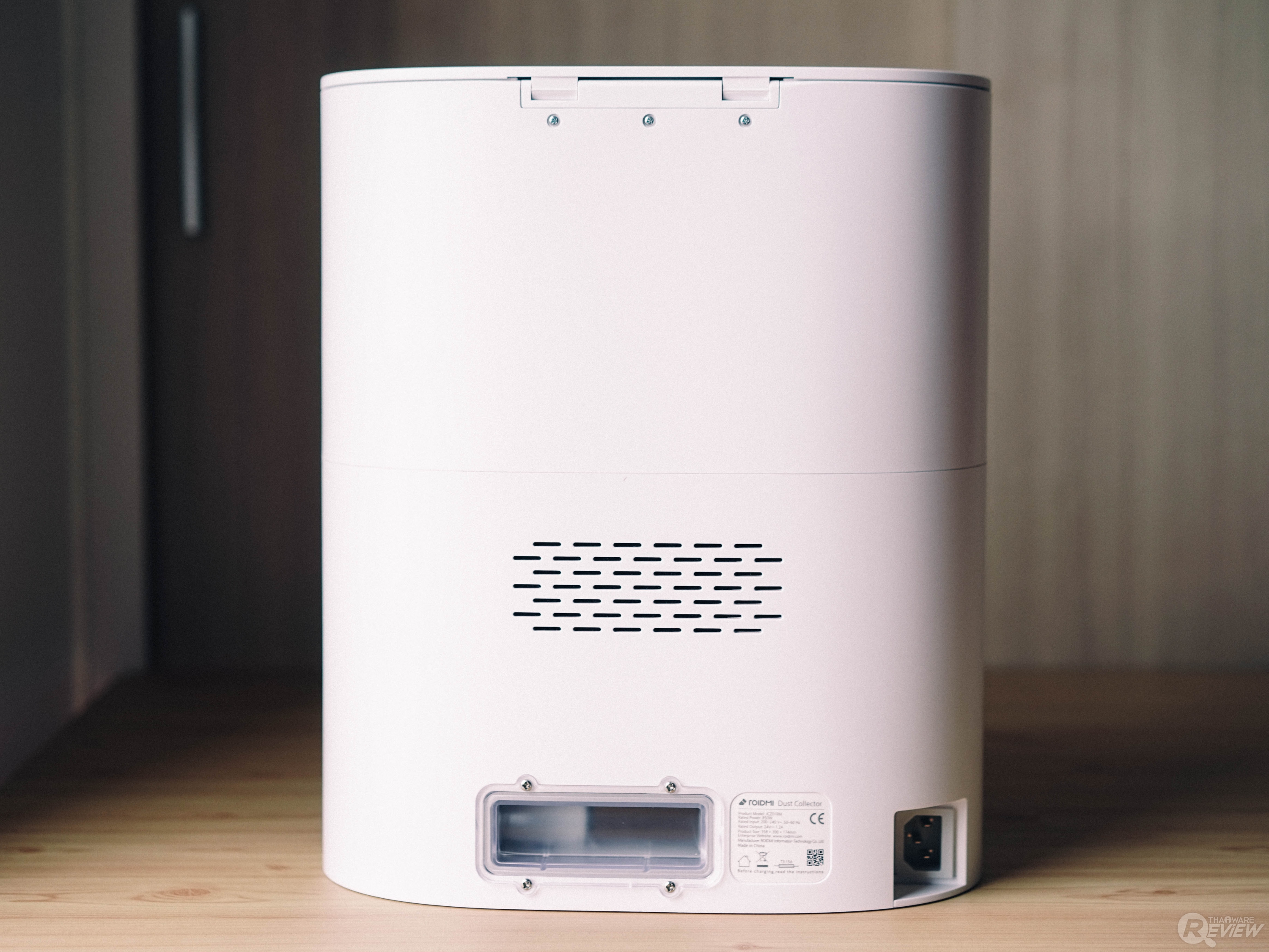 ด้านหลังของแท่นชาร์จจะมีช่องระบายความร้อนที่เกิดขึ้นขณะที่ดูดขยะ ตรงบริเวณฐานด้านล่างทำเป็นช่องใส เผื่อใครขี้สงสัยอยากเห็นว่าขยะที่กำลังถูกดูดจะมีสภาพเป็นอย่างไร แล้วก็มีช่องสำหรับเสียบปลั๊กอยู่ที่ด้านขวามือครับ ปลั๊กที่ให้มาสายมีความยาวประมาณ 1.2 เมตร