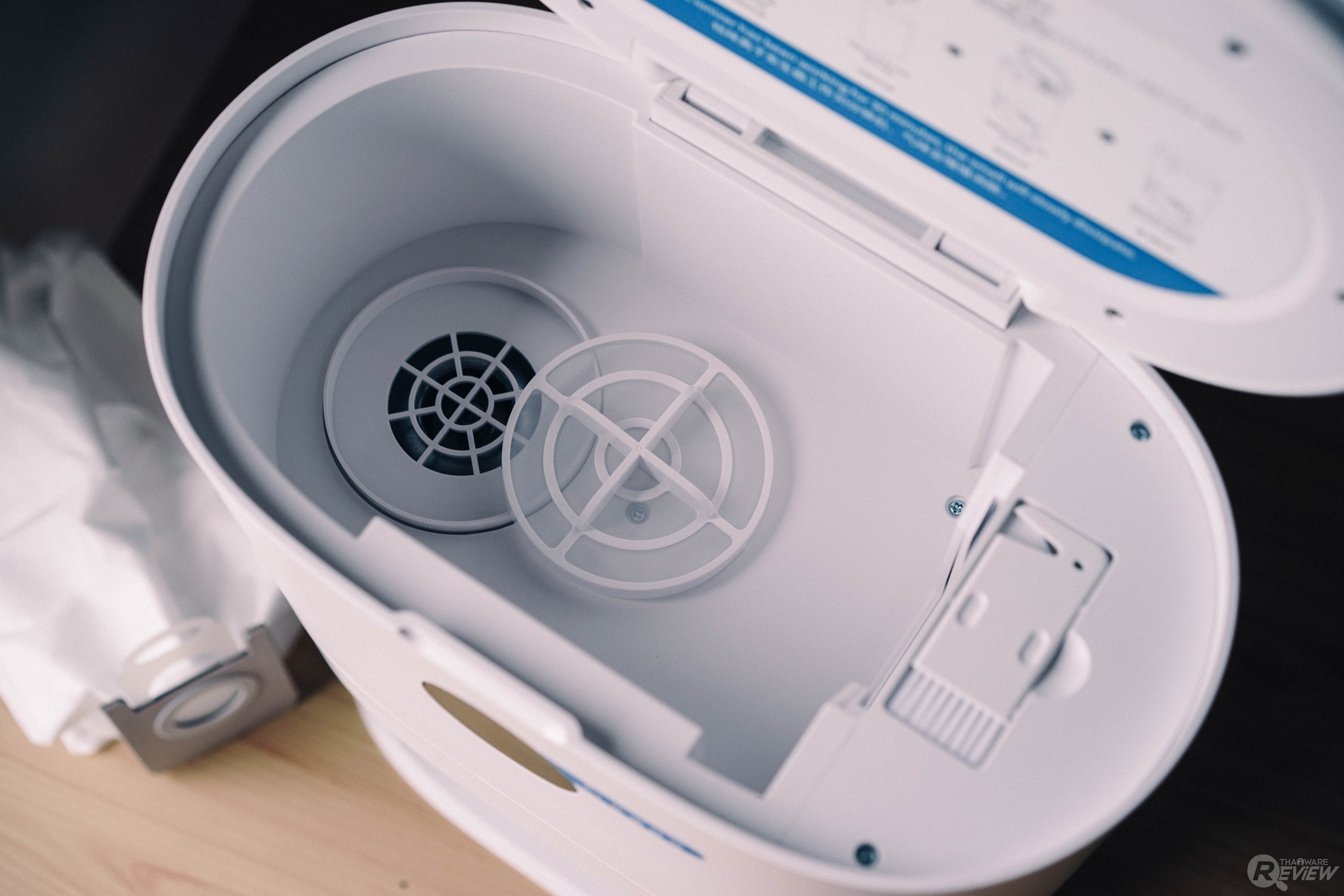 ถังเก็บขยะเป็นแบบไฮบริด มีจุกสำหรับเปิดใส่น้ำเพื่อถูพื้นได้ในตัว ไม่จำเป็นต้องเปลี่ยนไปใช้ถังสำหรับบรรจุน้ำโดยเฉพาะ อย่างไรก็ตาม ในกล่องไม่มีตัวช่วยอย่างกรวย หรือกระบอกฉีดน้ำมาให้ด้วย ดังนั้น ถ้าอยากให้การเติมน้ำเป็นเรื่องง่าย เราอาจจะต้องหาซื้อตัวช่วยเหล่านั้นมาใช้งานเองนะ ซึ่งจริง ๆ ก็หาไม่ยาก ตามร้านทุกอย่าง 20 บาท ก็มีวางจำหน่ายนะ