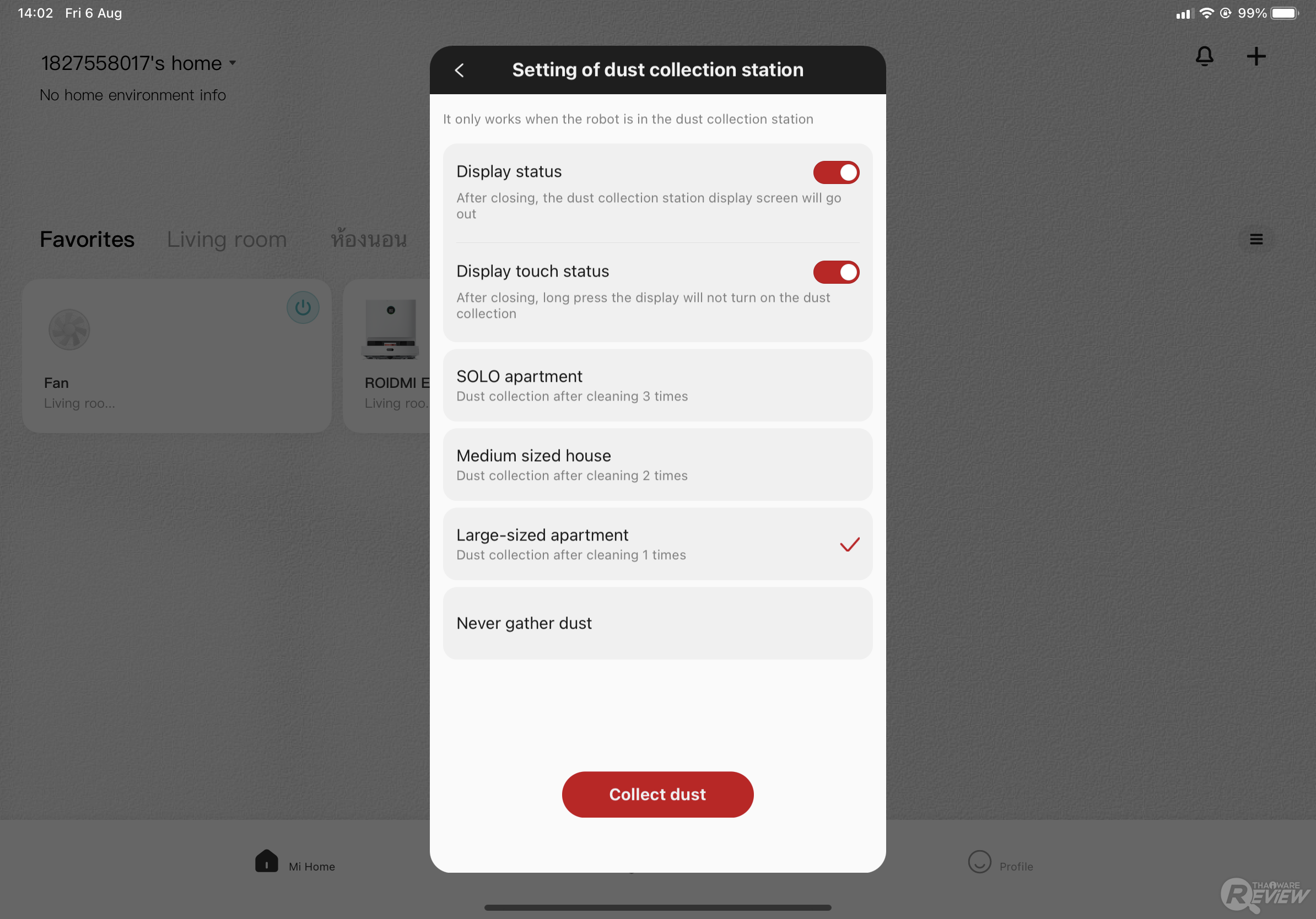 เนื่องจากแท่นชาร์จของ หุ่นยนต์ดูดฝุ่น ROIDMI EVE Plus ไม่ได้ทำหน้าที่แค่ชาร์จแบตเตอรี่เพียงอย่างเดียว จึงไม่น่าแปลกใจที่จะมีเมนูตั้งค่าถังเก็บขยะ + แท่นชาร์จ (Setting of dust collection station) มาให้ด้วย