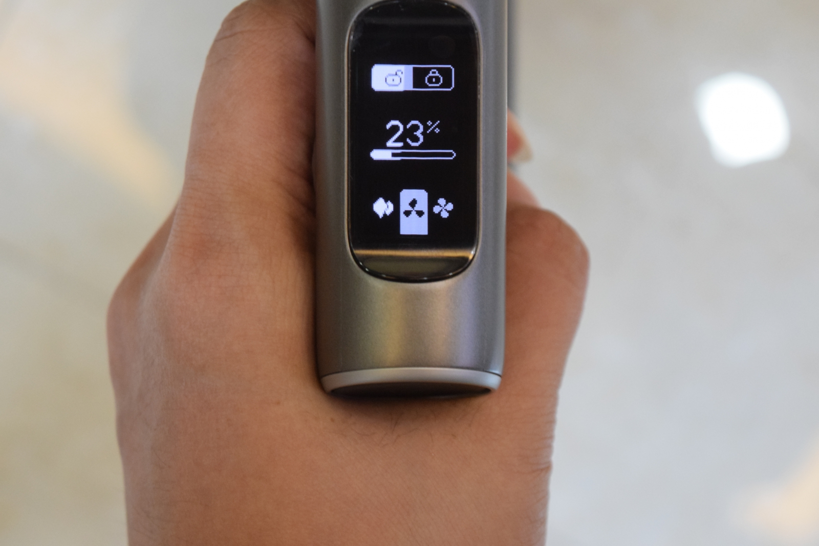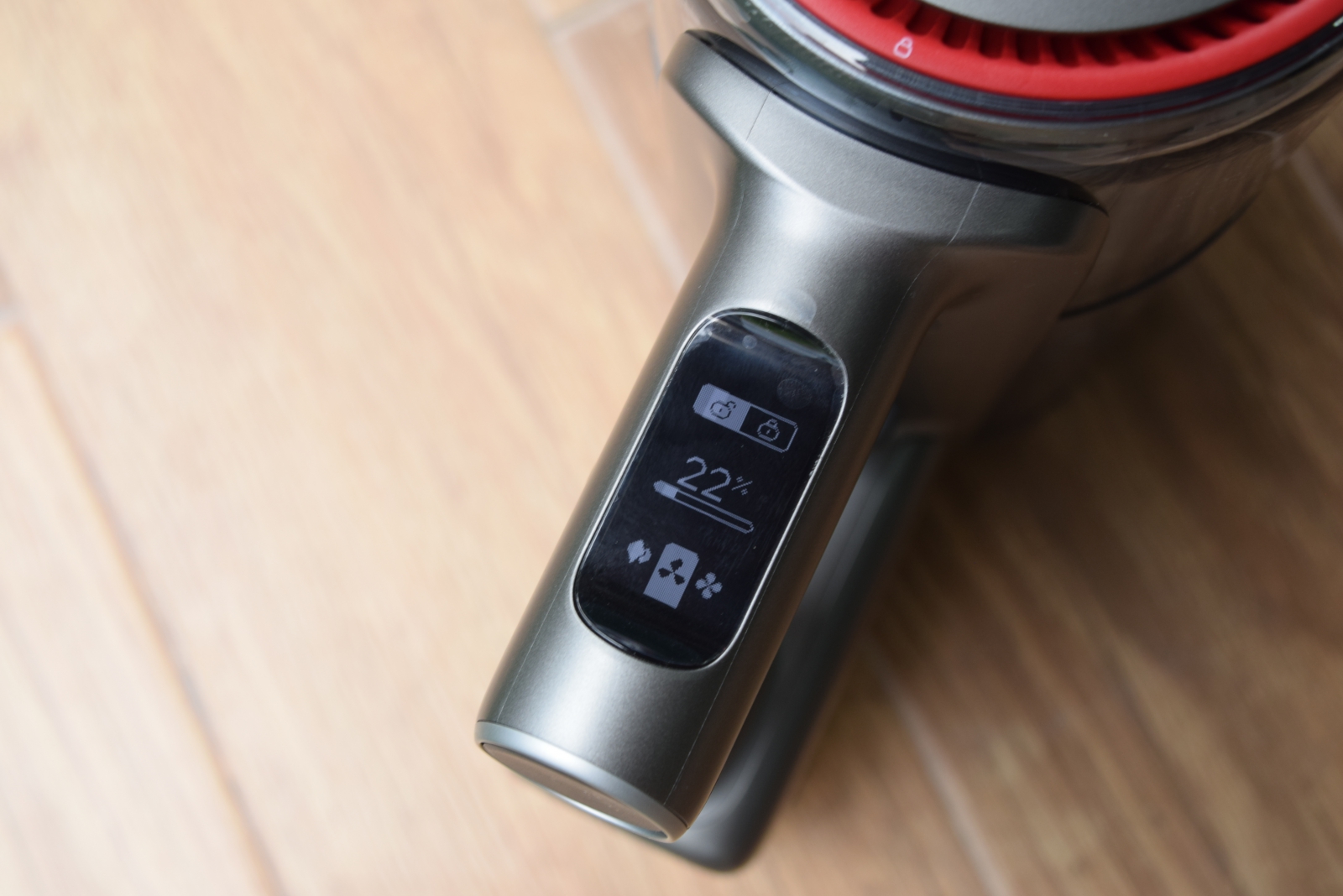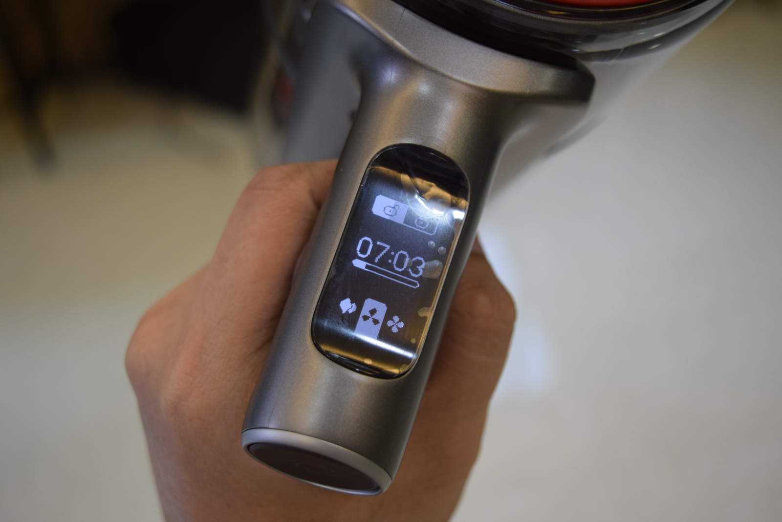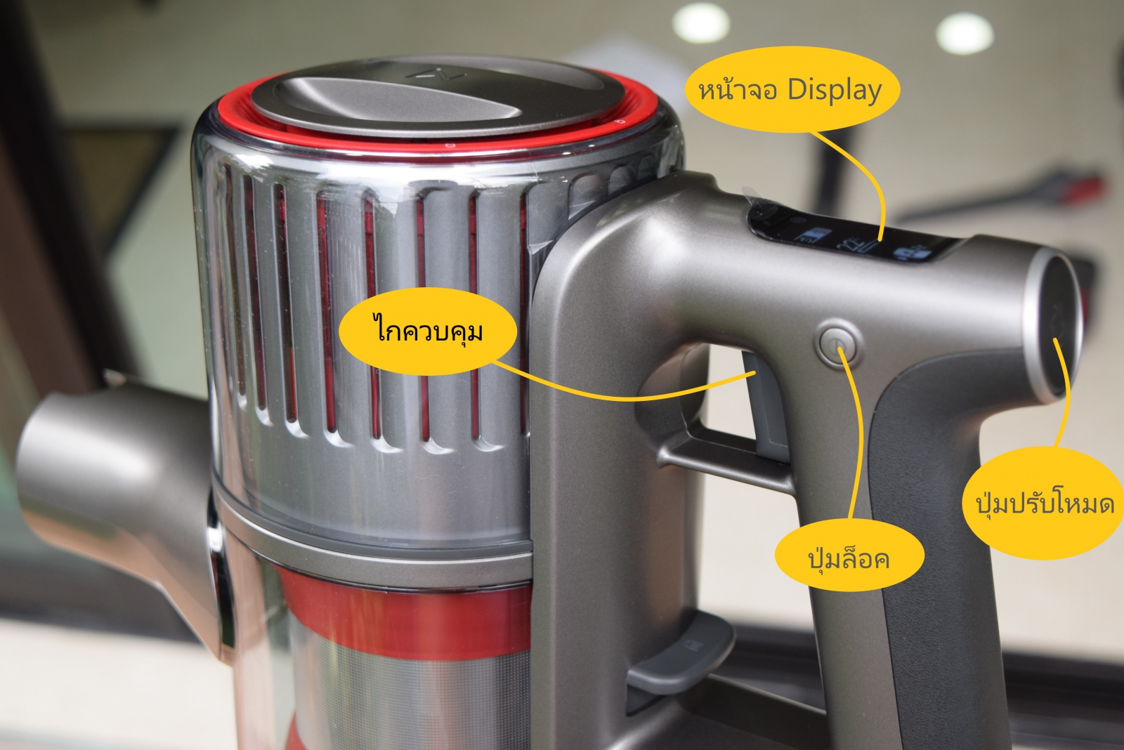 สำหรับการควบคุมของตัวเครื่องอยู่ที่ด้ามจับทั้งหมด หากสังเกตจะมีปุ่มไกที่ใช้ควบคุมการเปิด-ปิดเครื่องดูดฝุ่น ซึ่งพอเป็นแบบนี้ ก็ใช้งานง่ายดีเหมือนกัน ส่วนท้ายด้ามเป็นปุ่มปรับโหมดการทำงานและด้านข้างคือปุ่มล็อก มาพร้อมกับหน้าจอแสดงข้อมูลแบบ OLED บนด้ามจับ ที่สามารถใช้บอกสถานะโหมด, แบตเตอรี่ รวมถึงสถานะล็อกการทำงาน