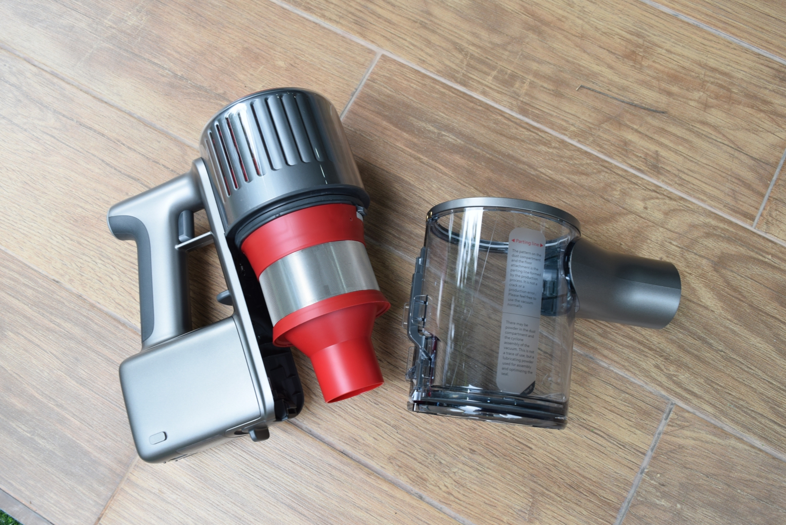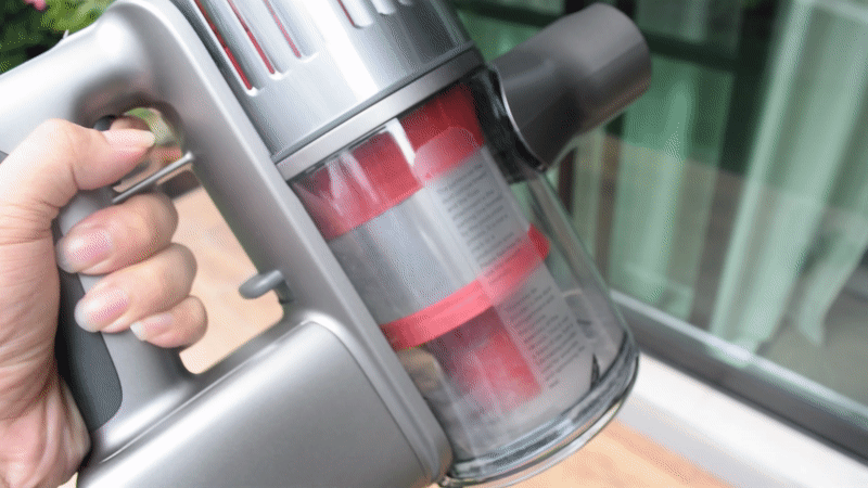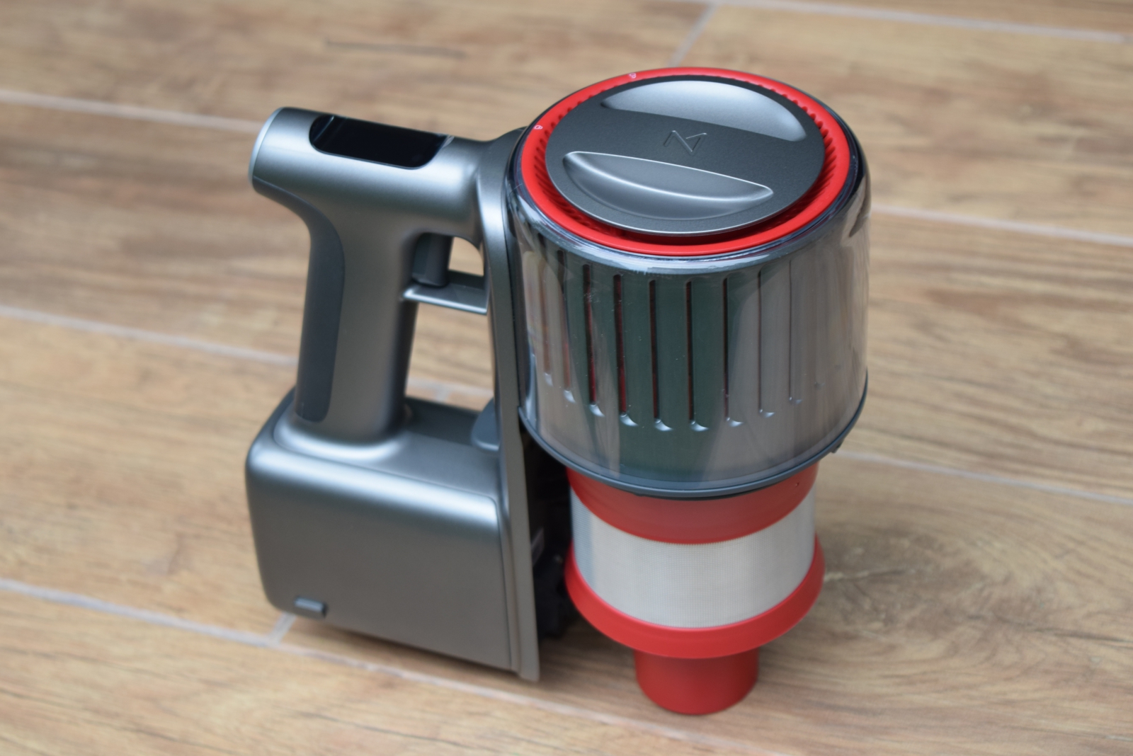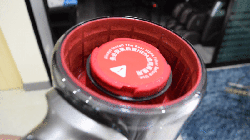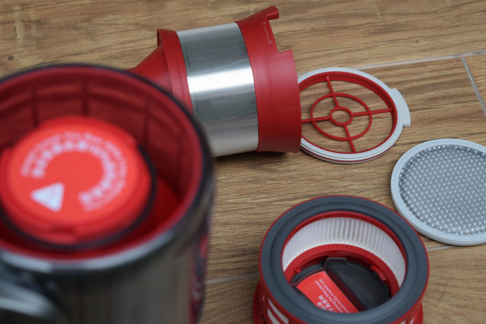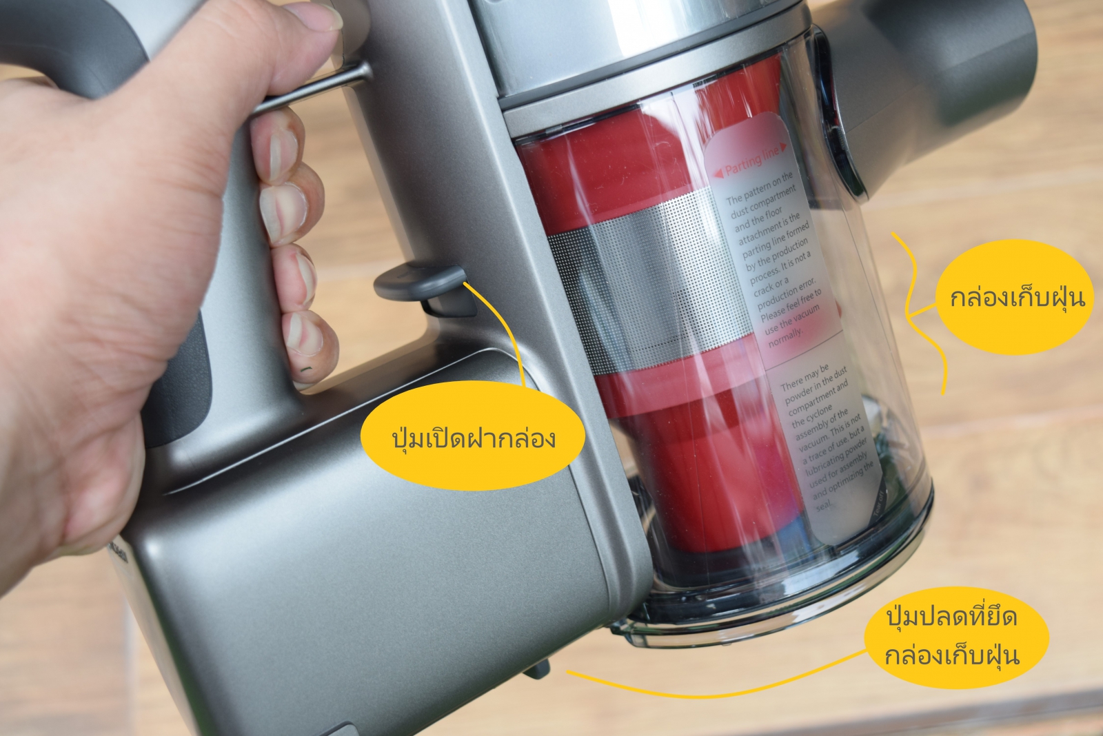 ในเครื่องบรรจุกล่องเก็บฝุ่นใสที่มีพื้นที่ 500 มิลลิลิตร ภายในยังครอบฟิลเตอร์กรองฝุ่น (สีแดง ๆ) เอาไว้อีกที ข้อดีคือเราเห็นได้ตลอดเวลาว่ากล่องเต็มหรือยัง และเวลาดูดฝุ่นเข้าไปก็จะเห็นขี้ฝุ่นปั่นอยู่ในเครื่องด้วยเป็นภาพที่แปลกตายิ่งนัก