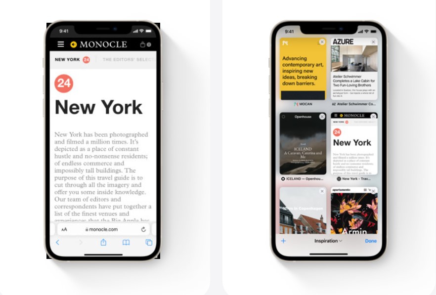 เวอร์ชันนี้แท็บเว็บไซต์ใน Safari จะเปลี่ยนมาโชว์ด้านล่างของหน้าจอและเราสามารถปัดซ้าย ปัดขวาเพื่อเปลี่ยนแท็บ หรือ สามารถปัดขึ้นเพื่อดูจอแท็บทั้งหมดที่เปิดอยู่ได้ นอกจากนี้คุณยังสามารถบันทึกและจัดกลุ่มแท็บให้ซิงก์กันระหว่างอุปกรณ์ เพื่อเปิดดูได้จากทุกที่
