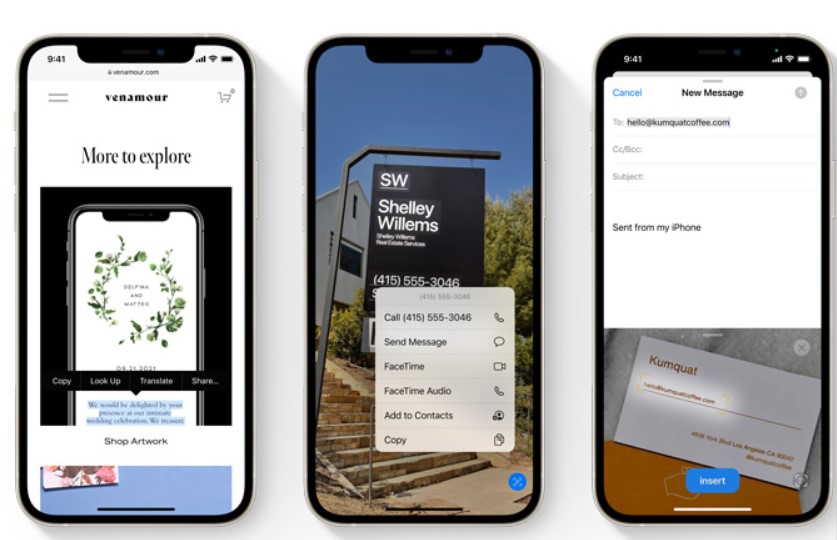 Live Text คุณสามารถถ่ายรูปและแตะตัวหนังในรูป เพื่อคัดลอก ส่งข้อความ หรือใช้โทรได้เลยหากเป็นเบอร์โทรศัพท์ นอกจากนี้ก็ยังมีโหมดในการแปลภาษาข้อความในรูป แต่เบื้องต้นรองรับเพียง 7 ภาษา อังกฤษ จีน ฝรั่งเศส อิตาลี เยอรมัน โปรตุเกส และสเปน