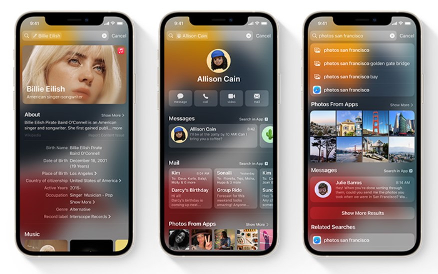 เมนู Spotlight ปรับปรุงใหม่ และฉลาดกว่าเดิมรวมถึงแสดงข้อมูลให้อ่านง่ายกว่าเดิม ถ้าเราต้องการค้นหาข้อมูลบางอย่างเช่นชื่อศิลปินดารา ก็จะโชว์ข้อมูลจาก Safari, ผลงานต่าง ๆ, เพลงจาก Apple Music หรือถ้าเราต้องการค้นหาข้อมูลผู้ติดต่อก็จะมี รูปภาพ ประวัติการแชท ประวัติการติดต่อในแอปพลิเคชันต่าง ๆ เป็นต้น
