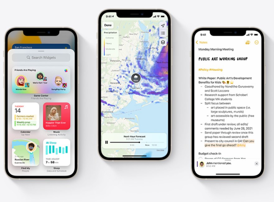 ในส่วนของ Notification Center ก็ออกแบบลุคใหม่ ให้สามารถโชว์รูปโปรไฟล์ของผู้ติดต่อ และขยายไอคอนแอปพลิเคชันให้ใหญ่ขึ้น นอกจากนี้ยังมีการสรุปแจ้งเตือนเป็นคอลเล็กชั่นให้เราดูทุกวันตามตารางที่เราตั้งไว้ ซึ่งการสรุปจะเรียงลำดับความสำคัญให้อัตโนมัติ และจะแสดงข้อมูลที่สำคัญที่สุดไว้ด้านบน