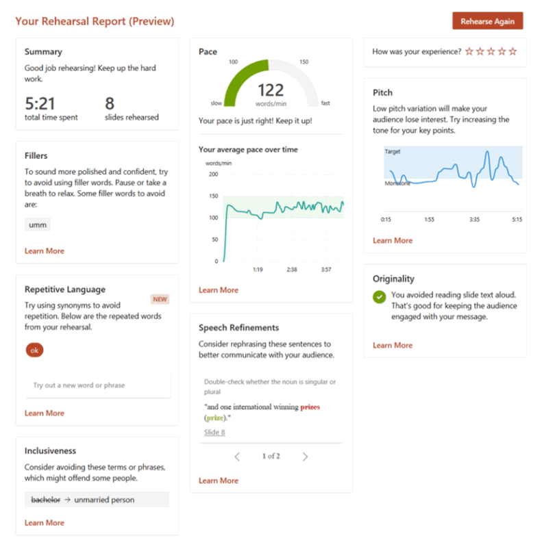 ประมาณปี ค.ศ. 2019 (พ.ศ. 2562) ทีม PowerPoint ประกาศว่าได้เพิ่มความสามารถใหม่ที่ชื่อว่า "Presenter Coach" โดยมีเป้าหมายที่จะช่วยให้คนทั่วไปได้ฝึกการพูดในที่สาธารณะ ขจัดความกลัวในการนำเสนองาน ช่วยแนะนำวิธีการพูดที่น่าฟังมากขึ้น ขอแค่มีไมโครโฟนและอินเตอร์เน็ตก็สามารถเรียกใช้โค้ชสอนพูดได้แล้วครับ