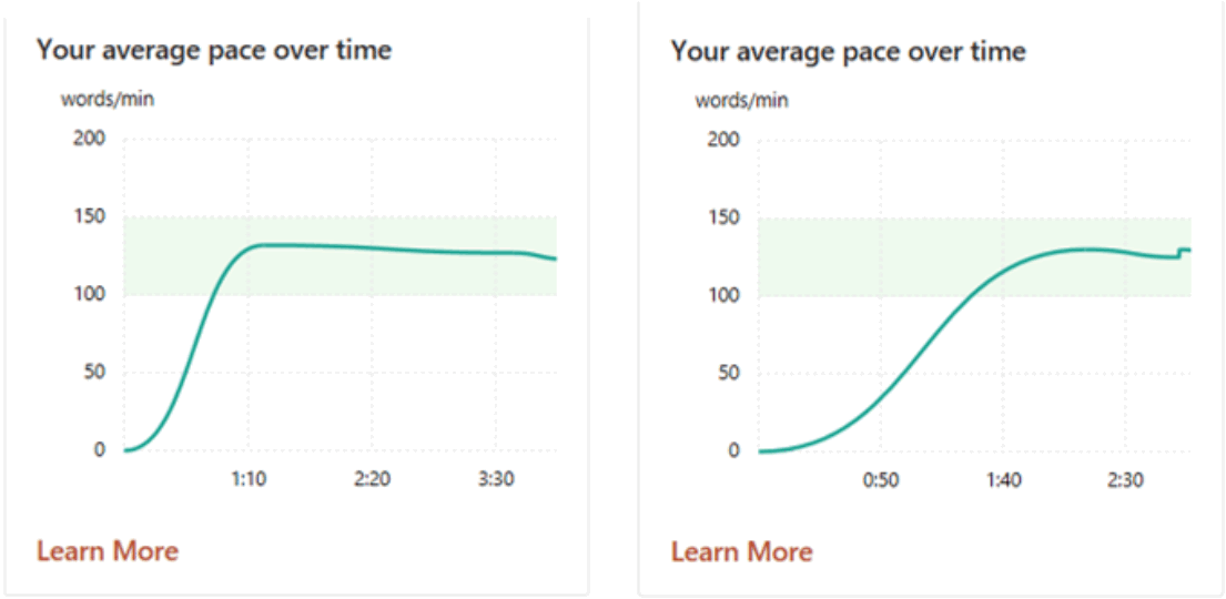 แถมด้วยค่าเฉลี่ยตลอดช่วงเวลาที่ฝึกซ้อม โดยจะเห็นว่าช่วงความเร็วที่เหมาะสมอยู่ที่ 100 ถึง 150 คำต่อนาที ผมลองใช้ AI วิเคราะห์การแถลงข่าวของผู้นำประเทศ 2 ท่าน ด้านซ้ายคือ แองเจล่า เมอร์เคล (เยอรมนี) และด้านขวา ลี เซียนลุง (สิงคโปร์) จะเห็นว่าพอเริ่มพูดนายกฯ เยอรมนีทำความเร็วได้คงที่ตลอดเลยทั้ง 3 นาที ส่วนฝั่งสิงคโปร์ ค่อย ๆ ไต่ระดับความเร็วมาเรื่อย ๆ จนทำความเร็วคงที่ในช่วงที่เหมาะสมได้