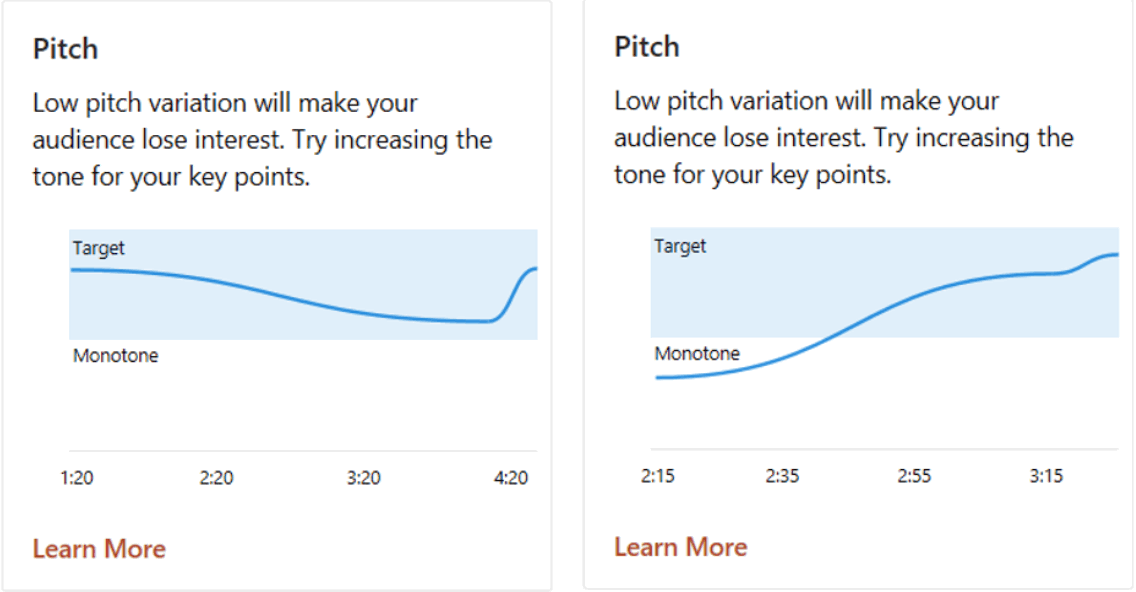 ประเด็นถัดมาที่เราจะได้เห็นข้อมูลสรุปจากโค้ชคือเรื่องระดับเสียง (Pitch) ซึ่งเป็นสำคัญมากในการพูดในที่สาธารณะ ในหน้าแดชบอร์ดนี้เราจะได้เห็นค่าระดับเสียงตลอดช่วงเวลาที่เราพูดเป็น ถ้าเราดูที่ผู้นำสองท่านก็จะเห็นว่านายกฯ เยอรมนีเสียงต่ำลงมาเรื่อย ๆ แต่ก็กลับสูงขึ้นในช่วงท้าย ส่วนนายกฯ สิงคโปร์ปรับระดับเสียงจากโมโนโทนในช่วงแรกมาอยู่ในช่วงที่เหมาะสมได้