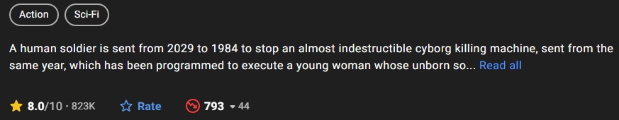 หนัง ภาพยนตร์ The Terminator ถือว่าเป็นหนึ่งในภาคที่ดีที่สุดของแฟรนไชส์ฅนเหล็ก มันได้คะแนนจากเว็บ IMDb 8/10 และได้มะเขือสดจาก Rotten Tomatoes ถึง 100% เต็ม