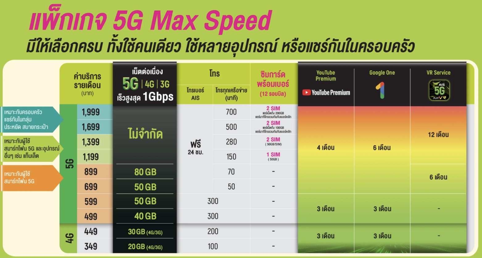 ส่วนแพ็กเกจ 5G ของ AIS มีแพ็กเกจ “5G Max Speed” สำหรับลูกค้าใหม่ มีให้เลือกทั้ง 4G และ 5G แต่ 5G จะมีราคาเริ่มต้นที่ 499 บาทต่อเดือน มาพร้อมอินเทอร์เน็ต 5G / 4G / 3G ความเร็วสูงสุด 1 Gbps สิทธิโทรฟรีในเครือข่ายและจำนวนนาทีโทรฟรีสำหรับเครือข่ายอื่น ๆ ส่วนสิทธิพิเศษด้านอื่น ๆ ก็มีให้เลือกพอสมควร อาทิ YouTube Premium ฟรี, พื้นที่เก็บข้อมูล Google One, AIS VR Service, ซิมการ์ดพร้อมเบอร์ใหม่ ฯลฯ