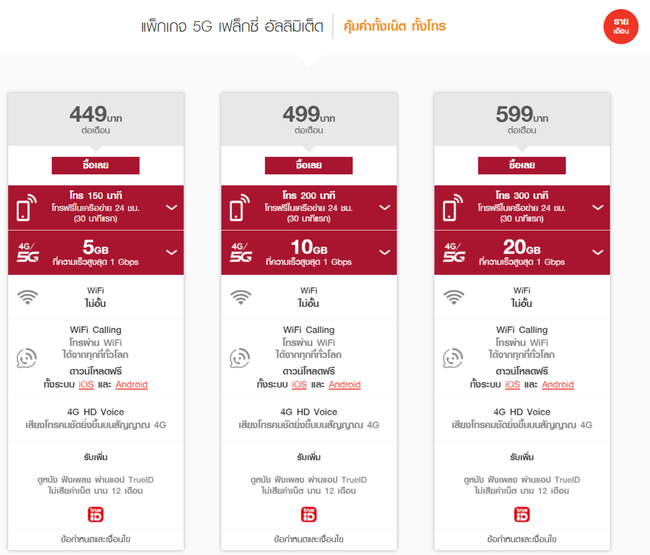 ยกตัวอย่างเช่น แพ็กเกจ 5G จาก TrueMove H สำหรับลูกค้าใหม่ ก็มีให้เลือกหลากหลายแบบตามช่วงราคา ส่วนแพ็กเกจที่น่าสนใจที่สุด ขอแนะนำ “แพ็กเกจ 5G เฟล็กซี่ อัลลิมิเต็ด” ราคาเริ่มต้น 449 ต่อเดือน ได้ทั้งอินเทอร์เน็ต 4G / 5G ความเร็วสูงสุด 1 Gbps, Wi-Fi ฟรีไม่อั้น นอกจากนี้ยังมีสิทธิพิเศษอย่าง ดูหนัง ฟังเพลงผ่านแอป TrueID ไม่เสียค่าเน็ต นาน 12 เดือน เรียกได้ว่าจัดเต็มกันเลย ในราคาที่น่าคบหา
