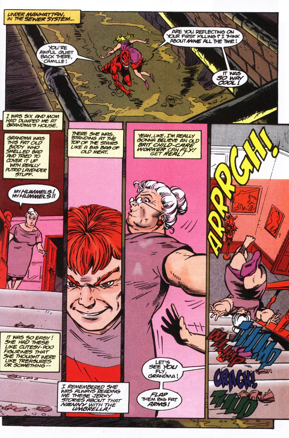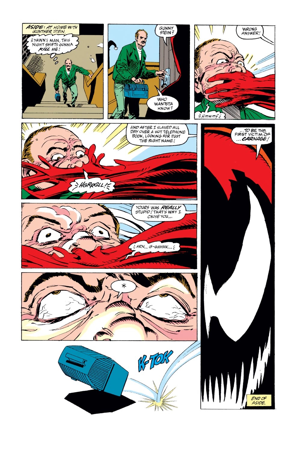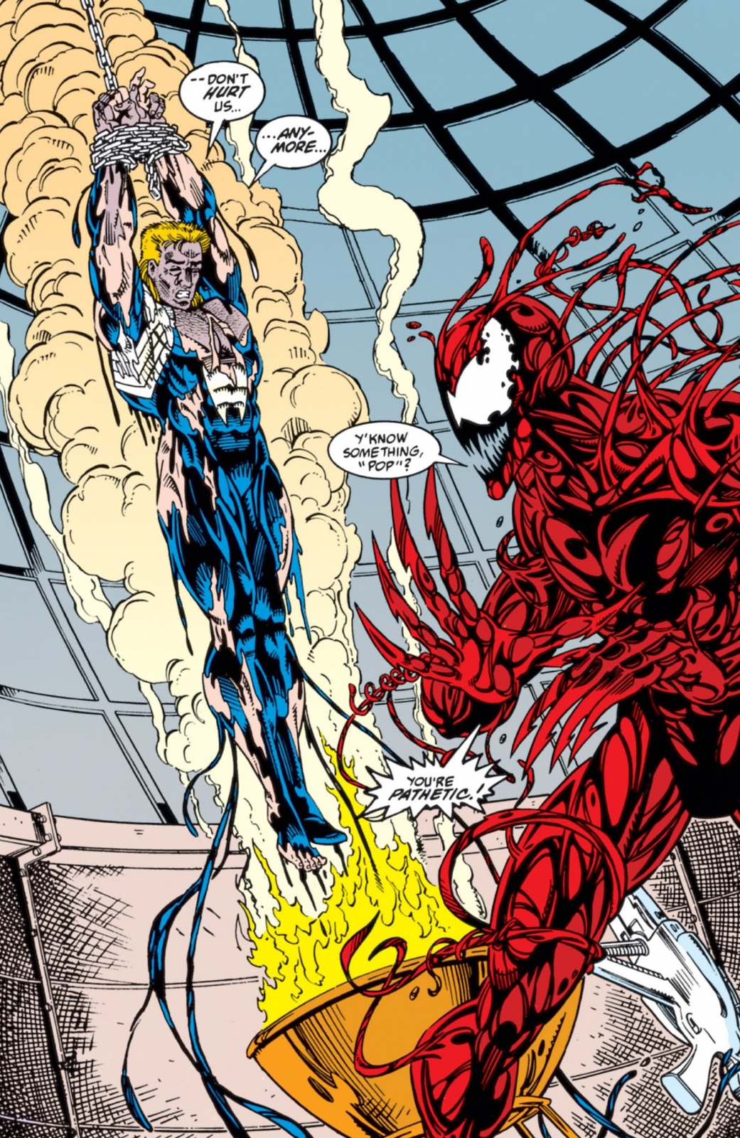 ในระหว่างที่ Carnage ปะทะกับ Spider-Man และ Venom ตัวของ Carnage ได้โยนเด็กทารกออกนอกตึกดื้อ ๆ อย่างไม่คิด เพื่อเบี่ยงเบนความสนใจให้เขาหนีไปได้