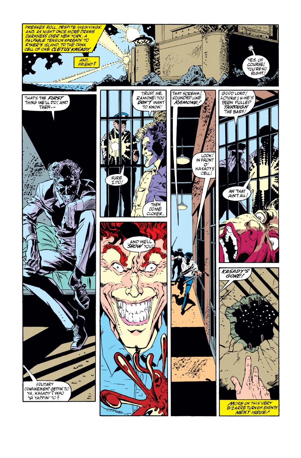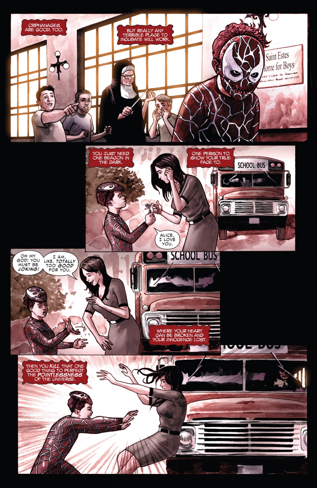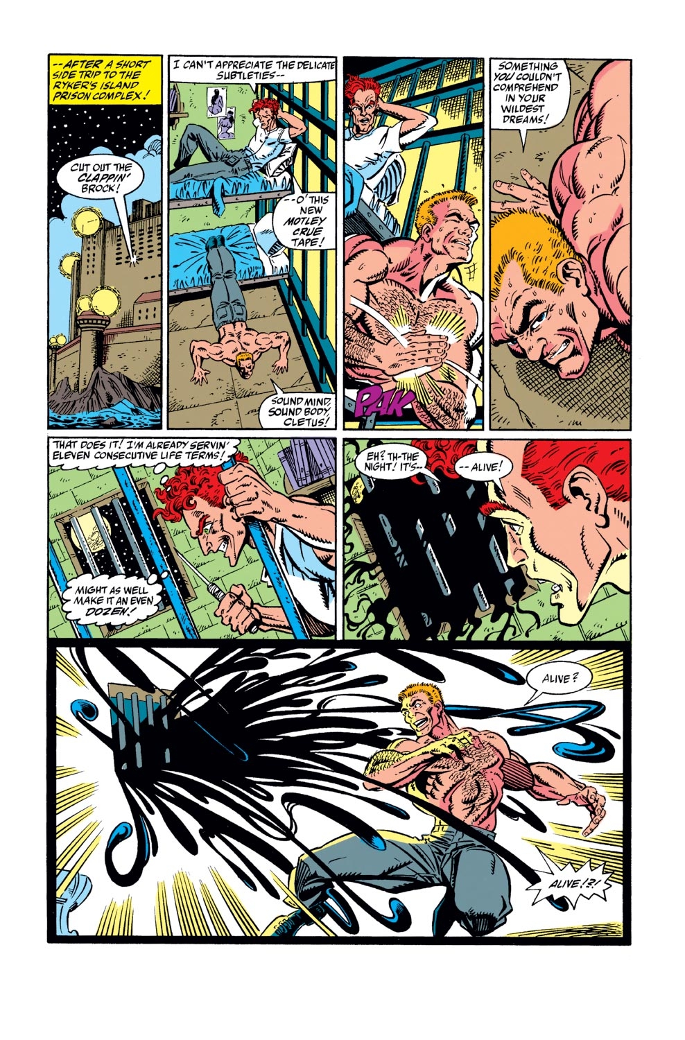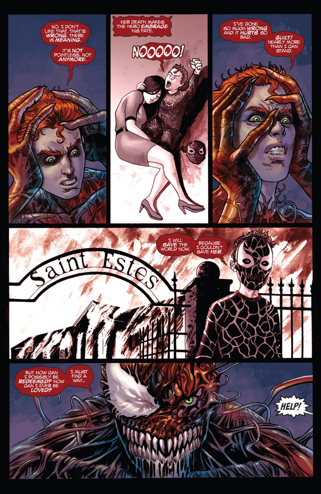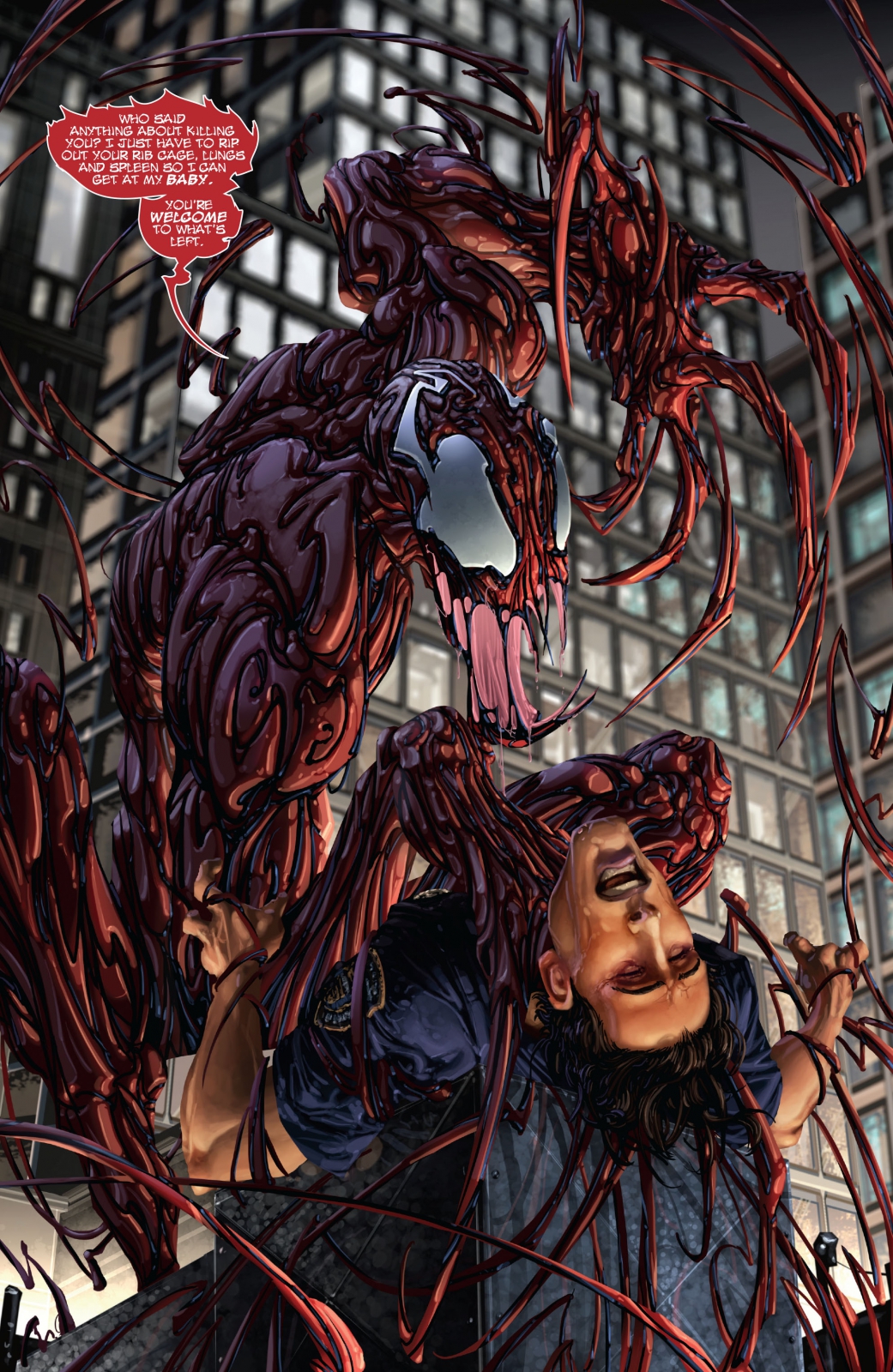ความแค้นที่สั่งสมของ Cletus ทำให้เขาตัดสินใจจะลอบฆ่า Eddie แต่ไม่นาน Venom ก็ปรากฏตัวมาช่วย Eddie แหกคุก แต่ในระหว่างทางที่ Venom มาช่วย มันกำลังท้องและมันก็ได้คลอดลูกออกมา จนลูกมันได้เข้าไปรวมตัว Cletus ก่อกำเนิดเป็น Carnage
