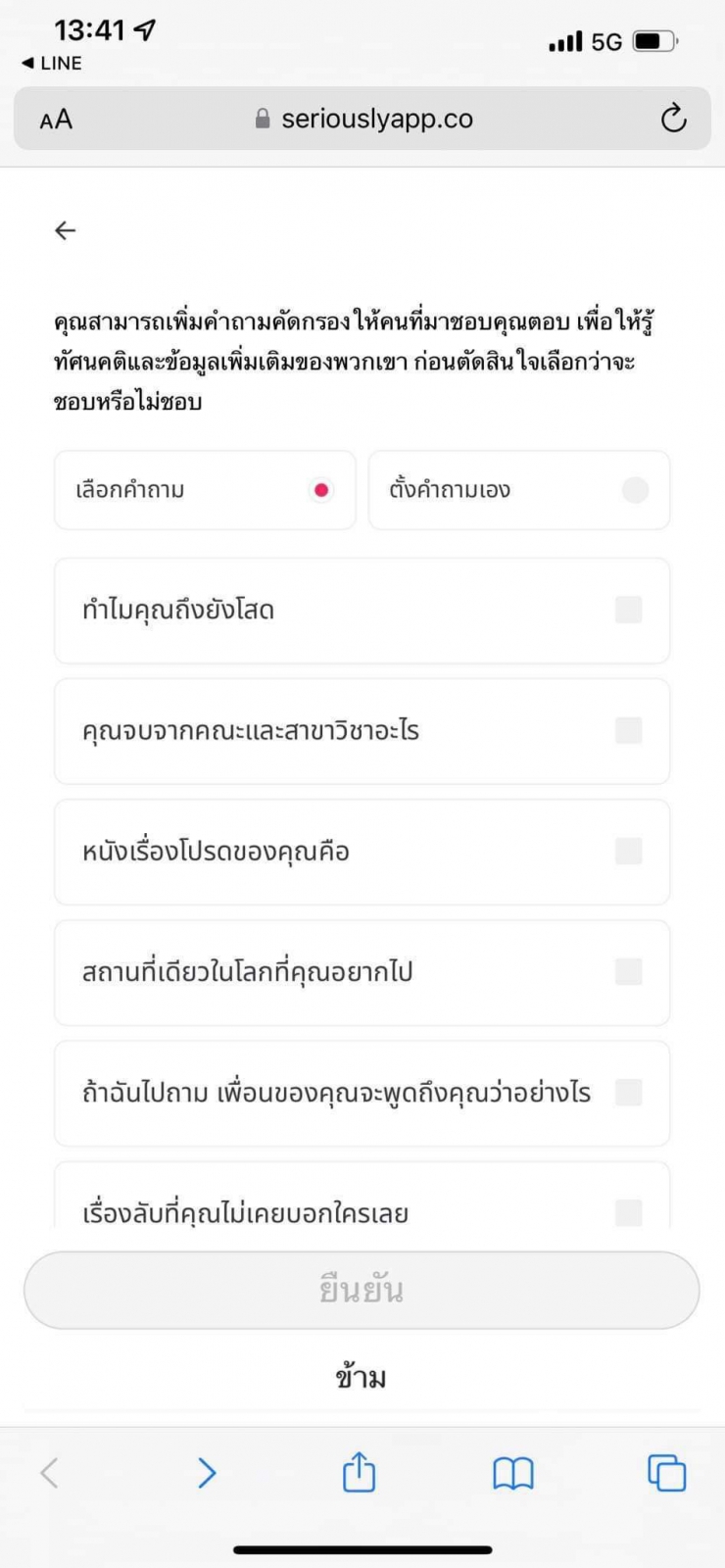 จากนั้นก็จะเป็นเรื่องของการกรอกข้อมูลส่วนตัวต่าง ๆ ตั้งแต่ เพศ ปีเกิด ที่อยู่ อาชีพ ส่วนสูง กิจกรรมที่ชอบทำ อาหารที่ชอบ นิสัย และอื่น ๆ พร้อมกับการเลือกสเปกคนที่เราอยากจะเจอในแอป Seriously