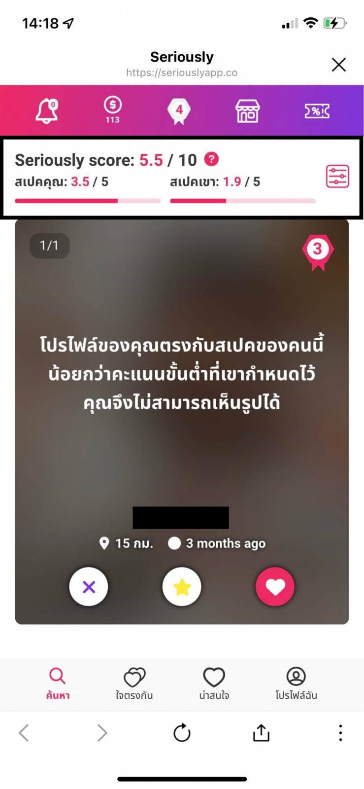 นอกจากนี้ ถ้าหากฝั่งตรงข้ามตั้งค่าไว้ว่าคะแนนต้องตรงสเปกขั้นต่ำเท่าไหร่ แล้วปรากฏว่าคุณมีคะแนนไม่ตรงตามที่เขาต้องการ บางทีคุณอาจจะไม่สามารถดูรูปโปรไฟล์ของเขาได้ด้วยซ้ำ เหมือนภาพตัวอย่าง
