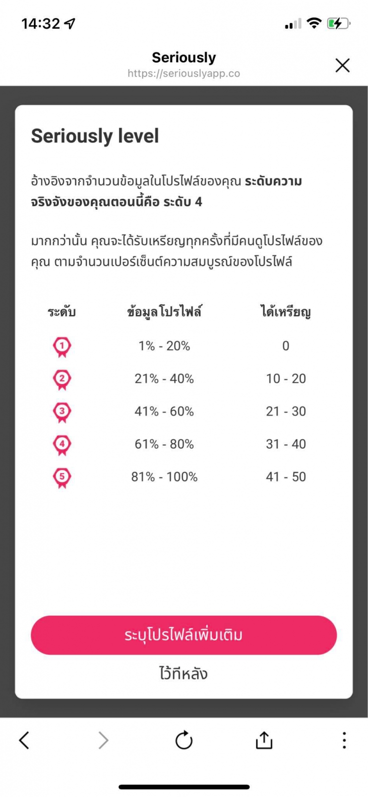 ดังนั้นถ้าต้องการหาแฟนจริงจังในแอปนี้ การกรอกข้อมูลโปรไฟล์ให้ละเอียดเลยเป็นสิ่งจำเป็น อีกทางหนึ่งก็ยังเป็นการคัดกรองคนที่เข้ามาเล่นและไม่จริงจังเช่นกัน ซึ่งโปรไฟล์ของเราจะมีระดับความจริงจัง (Seriously Level) ระบุไว้ โดยมีระดับสูงสุดคือเลเวล 5 ถ้าตอนนี้เลเวลคุณไม่ถึง 5 ก็ถือว่าคุณยังจริงจังไม่พอนะ