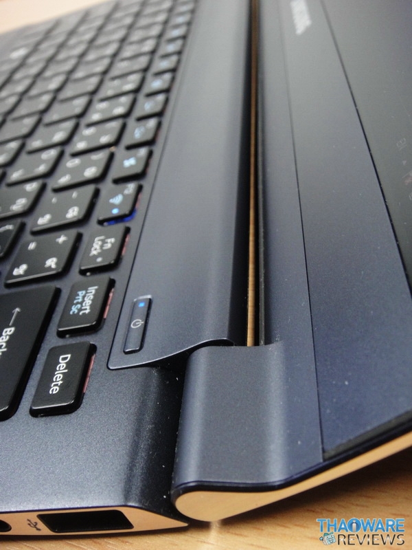ปุ่มเปิดปิดอยู่ด้านขวามือ ฝั่งซ้ายมือมีไฟแสดงสถานะการชาร์จไฟ และเซนเซอร์ตรวจจับแสงสว่าง เพื่อปรับความสว่างของหน้าจอและไฟที่คีย์บอร์ดโดยอัตโนมัติ