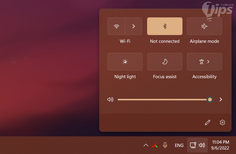 เราสามารถเรียกใช้งาน "เมนู Quick Settings" ได้ด้วยการกด "ปุ่ม Windows + a" หรือคลิกที่ "ไอคอนลำโพง" ตรงที่อยู่ด้านขวาสุดของ Taskbar