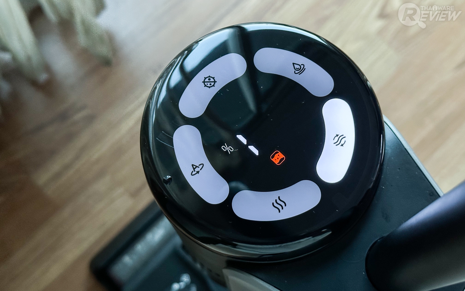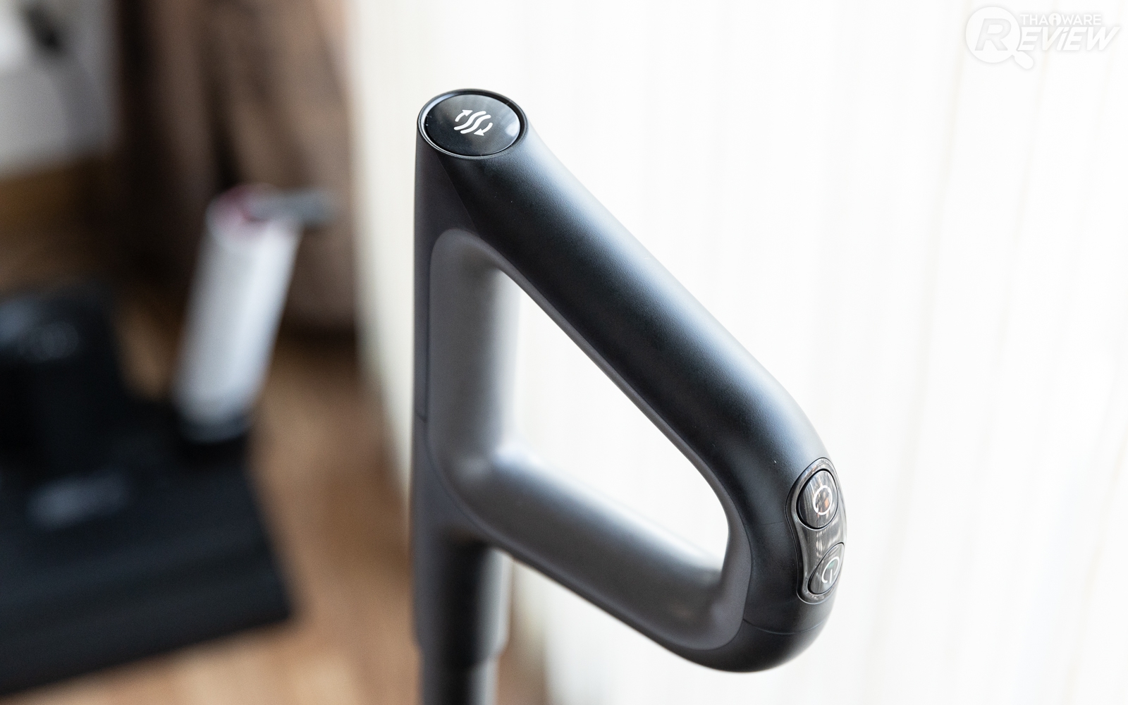 บนด้านจับจะมีปุ่มอยู่ 3 ปุ่ม ปุ่มเปิด/ปิดเครื่อง, ปุ่มเปลี่ยนโหมดทำความสะอาด และปุ่มทำความสะอาดตัวเอง ตรงนี้ออกแบบมาฉลาดมาก เขาเอาปุ่มที่ต้องกดบ่อย ๆ อย่างปุ่มเปิด/ปิด และปุ่มเปลี่ยนโหมดทำความสะอาดไว้ที่นิ้วโป้งตรงด้ามจับทำให้เรากดในขณะที่กำลังใช้งานได้อย่างสะดวก
