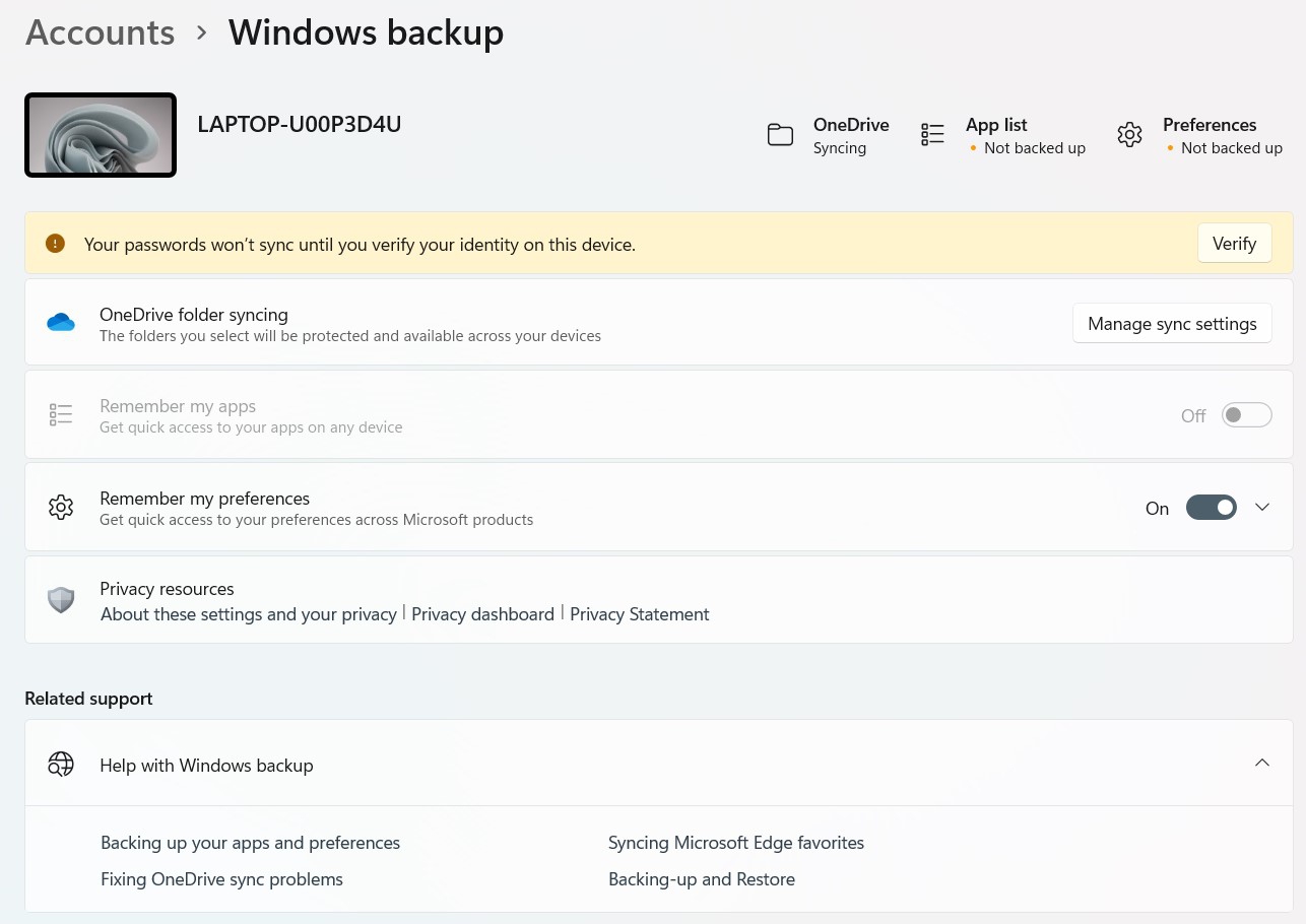 ฟีเจอร์ Windows Backup สามารถสำรองข้อมูลได้ทั้ง แอปพลิเคชัน (Application) การตั้งค่าต่าง ๆ ไปจนถึงรหัสผ่านเข้าเว็บไซต์และระบบต่าง ๆ เพียงเข้าไปที่ "เมนู Accounts → Windows Backup" ก็จะมีฟีเจอร์ย่อยต่าง ๆ รวมถึงคู่มือสอนการใช้งาน
