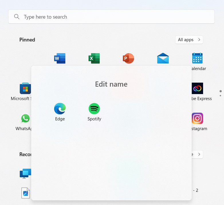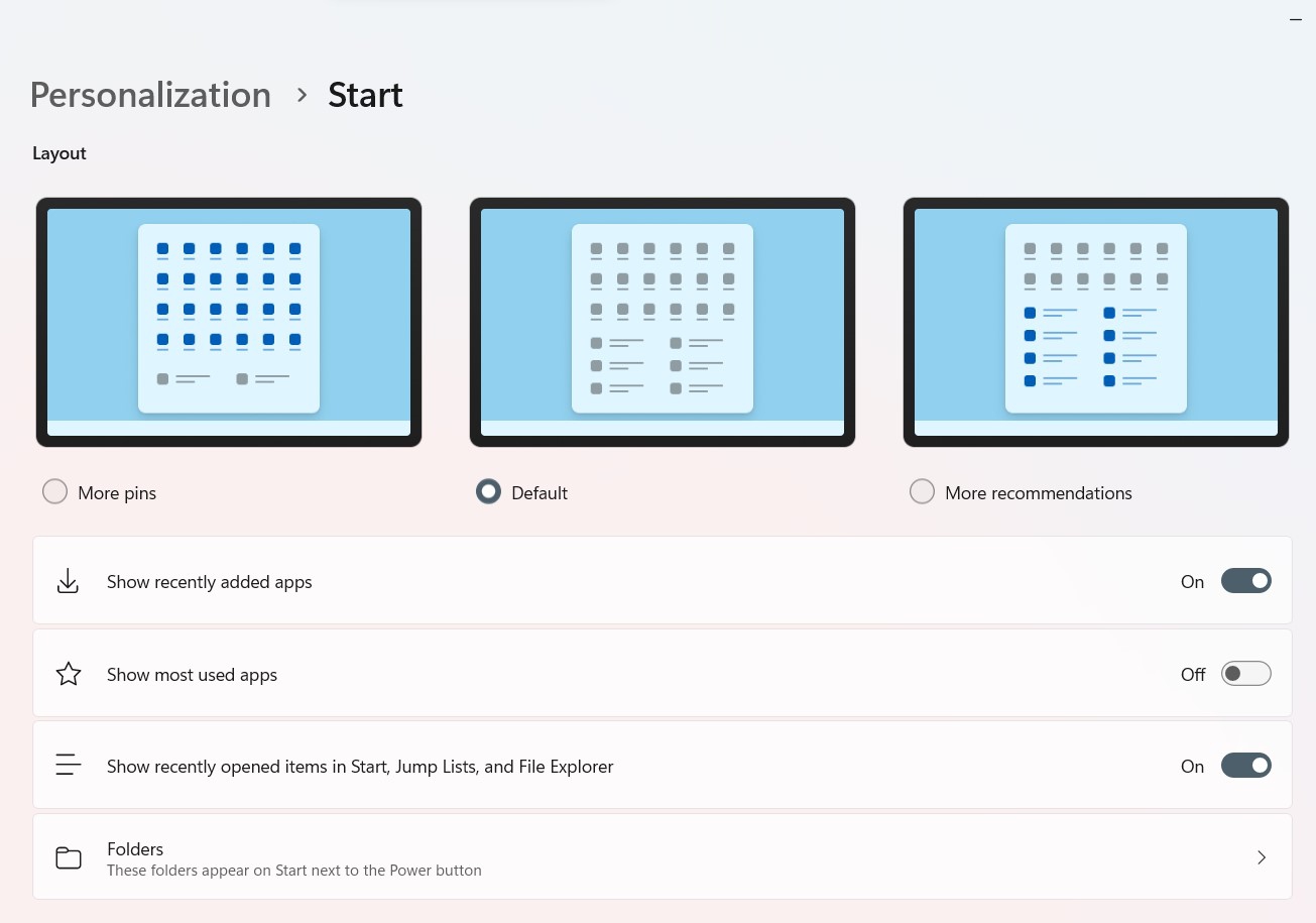 "เมนู Start" บนระบบปฏิบัติการ Windows 11 เลือกได้ทั้งการแสดงแอปพลิเคชันที่ถูกปักหมุดไว้ แอปพลิเคชันทั้งหมด, เพิ่มเติมจำนวนแอปพลิเคชันที่ปักหมุดได้ หรือจะเพิ่ม More Recommended ที่แสดงไฟล์ที่ระบบจดจำว่าผู้ใช้ใช้งานไฟล์เหล่านี้บ่อย ๆ หรือไฟล์ โฟลเดอร์ที่เพิ่งเปิดใช้งาน