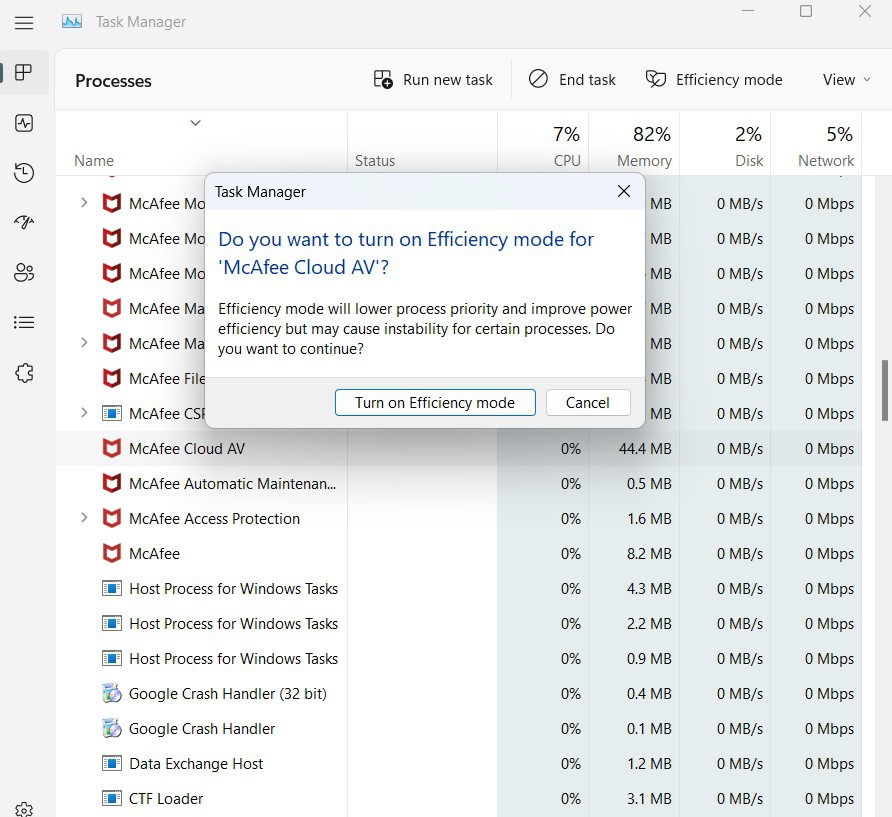 เมื่อเปิด "เมนู Task Manager" จะพบว่า มี "โหมดประสิทธิภาพ (Efficiency Mode)" เพิ่มขึ้นมา หากเปิดโหมดนี้ที่แอปพลิเคชันใด คือการจำกัดทรัพยากรของแอปพลิเคชันที่ใช้อยู่ (รองรับเฉพาะบางแอปฯ) ช่วยให้การทำงานของคอมพิวเตอร์ราบรื่น ลื่นยิ่งขึ้น