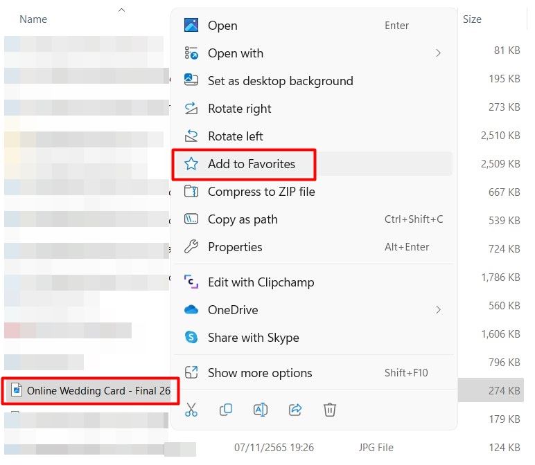 แม้ File Explorer จะมีให้ปักหมุด (Pin) ไปที่ Folder ที่ใช้งานบ่อย ๆ แต่บางครั้งก็มีไฟล์ที่ต้องใช้งานบ่อย ๆ เหมือนกัน ซึ่งผู้ใช้สามารถเพิ่มไฟล์ที่ชอบหรือใช้งานบ่อยด้วยการคลิกขวาที่ไฟล์นั้น ๆ แล้วเลือก "ตัวเลือก Add to Favorites" เพียงเท่านี้ ไฟล์ก็จะไปอยู่หน้าแรกของ File Explorer ในส่วนของ Favorites