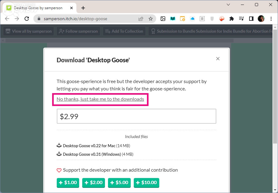 โปรแกรม Desktop Goose รองรับทั้งระบบปฏิบัติการ Windows และ macOS ทางผู้พัฒนาเค้าเปิดให้ดาวน์โหลดมาใช้งานได้ฟรี โดยหากต้องการสนับสนุนก็สามารถบริจาคให้ผู้พัฒนาได้ แต่ถ้าไม่ก็คลิกที่ "ปุ่ม No Thanks, Just take me to the Downloads" เพื่อเริ่มดาวน์โหลดโดยไม่บริจาคได้เลย