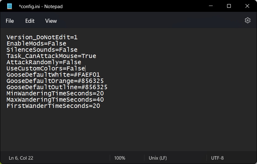 เราสามารถปรับแต่งสี และพฤติกรรมของ "ห่าน" ได้ในระดับหนึ่ง แต่เนื่องจากมันไม่มีเมนูตั้งค่า ในการปรับแต่งเราต้องแก้ไขที่ไฟล์ "config.ini" โดยเราสามารถเปิดมันขึ้นมาด้วยโปรแกรม Notepad ที่มาพร้อมกับระบบปฏิบัติการ Windows ได้เลย เปิดขึ้นมาเราก็จะเจอกับคำสั่งดังภาพด้านล่างนี้