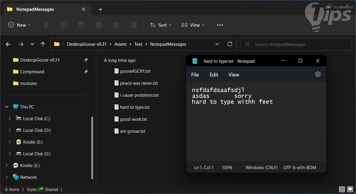 ในส่วนของข้อความ เราสามารถเข้าไปเพิ่มไฟล์ .TXT ได้ที่โฟลเดอร์ "Desktop Goose v0.31\DesktopGoose v0.31\Assets\Text\NotepadMessages" อยากให้ห่านพิมพ์ว่าอะไร เราก็เข้าไปสร้างไฟล์เพิ่มได้เลย