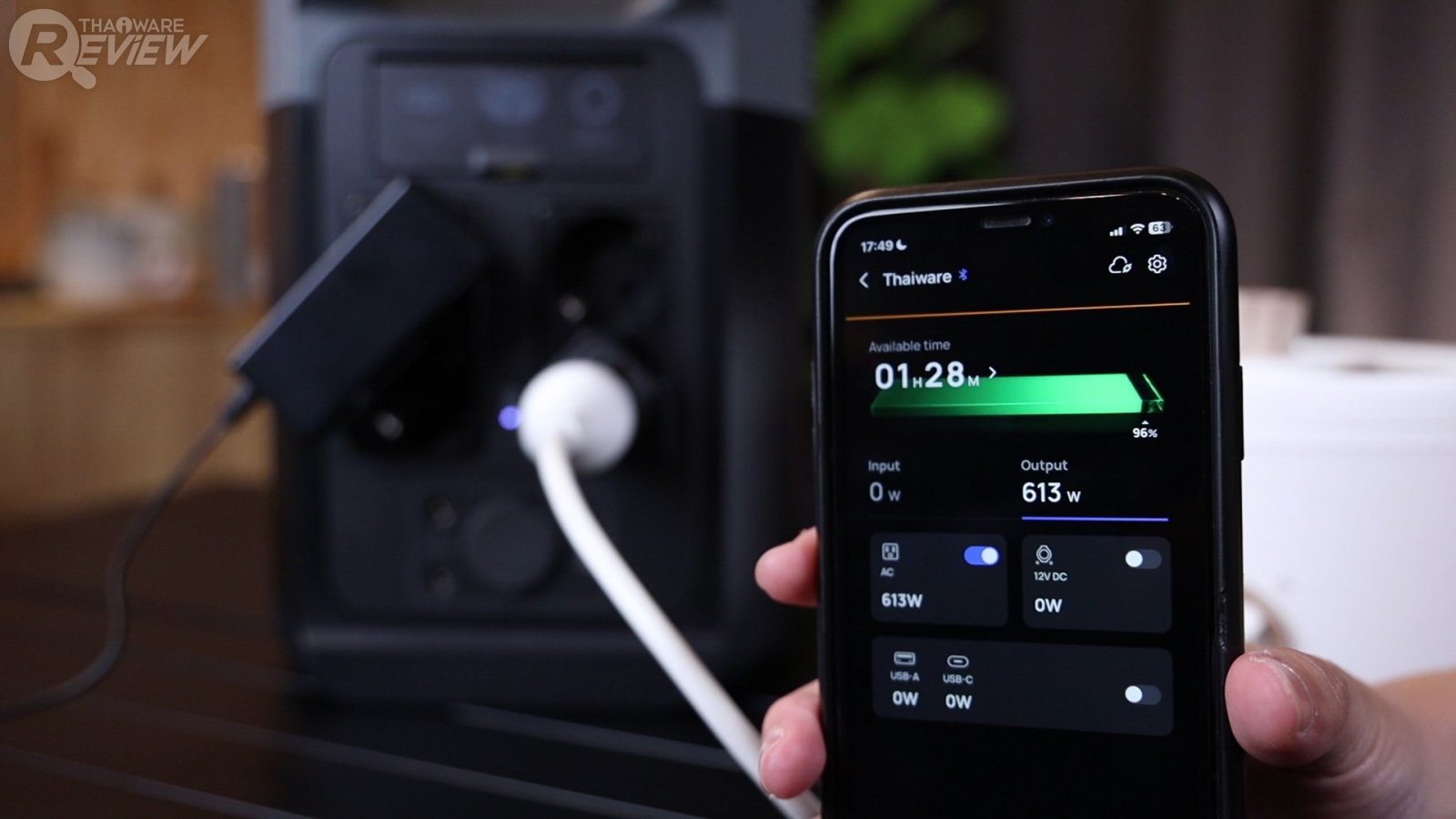 หลังจากใช้งานเสร็จ ก็สามารถชาร์จไฟด้วยระบบไฟบ้าน AC ได้เลย เสียบปลั๊กไฟที่แถมมาที่ด้านหลังเครื่อง จากนั้นเสียบเข้ากับปลั๊กไฟบ้าน ตัวเครื่องจะชาร์จไฟด้วยความเร็วสูงที่ 1200W ทันที ด้วยระบบ X-Stream ทำให้ตัวเครื่องชาร์จไฟจาก 0-80% ได้ภายใน 50 นาที และชาร์จเต็ม 100% ได้ภายใน 1 ชั่วโมง 20 นาที เท่านั้น คือ ชาร์จไวจริงตามที่สเปกบอกเลย ชาร์จไว เอาไปใช้งานต่อได้สบาย ๆ