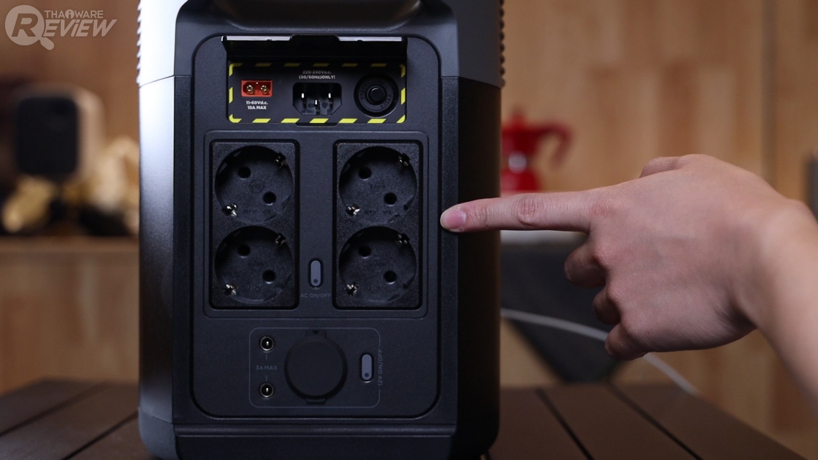 มาดูปลั๊กไฟด้านหลังกัน Delta 2 ที่วางจำหน่ายในประเทศไทยตอนนี้จะเป็นโมเดลที่ใช้ปลั๊กไฟแบบ EU นะครับ ซึ่งก็ขึ้นชื่อเรื่องความปลอดภัย เสียบปลั๊กได้แน่นไม่มีหลุดแน่นอน แต่ถ้าใครที่อยากใช้เครื่องใช้ไฟฟ้าแบบอื่น ๆ ก็มีหัวแปลง Adapter แถมมาให้ เสียบใช้งานปลั๊กหัวแบน และ หัวกลม ได้ตามที่เห็นในรูปเลย
