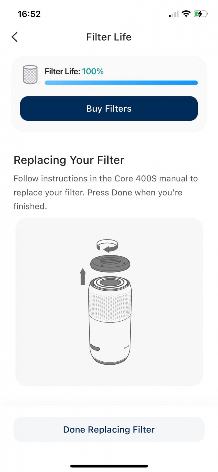 ในแอปพลิเคชัน VeSync มีระบบ Filter Life Monitor ให้เราดูสภาพอายุการใช้งานของฟีลเตอร์ด้วย แถมบอกเป็นเปอร์เซ็นชัดเจน เมื่อใกล้หมดก็เตรียมซื้อเปลี่ยนได้เลยทันที ถ้าเป็นบางรุ่นอาจจะไม่มีบอกแบบนี้ ผู้ใช้ก็จะไม่รู้ว่าไส้กรองควรเปลี่ยนเมื่อไหร่ ต้องสังเกตด้วยสายตาเอาเอง หรือหากมีบอกก็ไม่ได้รายงานเป็นเปอร์เซ็น และแจ้งเตือนให้เปลี่ยนเลย การบอกละเอียดไว้ ก็ถือว่าสะดวกเหมือนกัน