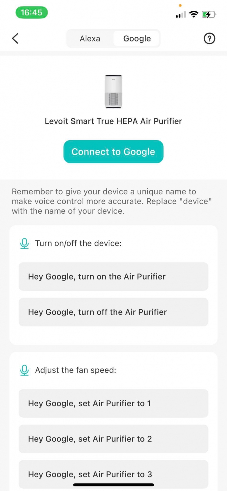การสั่งงานด้วยเสียงผ่าน VeSync สามารถทำได้ผ่าน Google Assistant นอกจากนี้ยังมี Alexa แต่ในไทยจะยังใช้ไม่ได้ นี่ก็เป็นอีกหนึ่งฟีเจอร์ที่จะมีเฉพาะในเครื่องฟอกอากาศบางรุ่น และหนึ่งในนั้นก็คือ เครื่องฟอกอากาศ Levoit Core 400S โดยประโยคคำสั่งก็จะมีกำหนดไว้ให้พร้อมตั้งแต่การสั่ง เปิดเครื่อง / ปิดเครื่อง, การปรับโหมด และคำสั่งอื่น ๆ